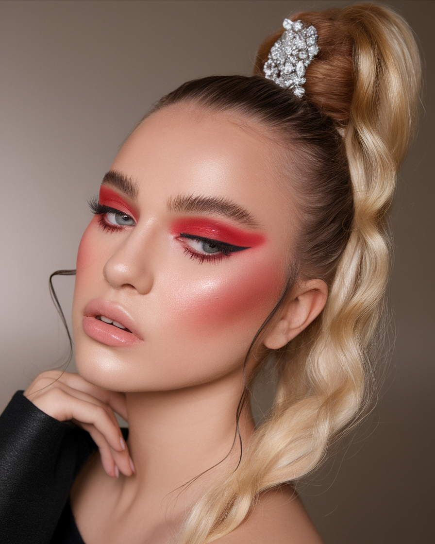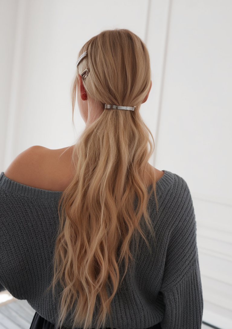 This modern and trendy 2025 hairstyle features a sleek high ponytail with loose, defined waves, creating a structured yet playful look. The warm blonde gradient enhances dimension, making it an excellent choice for spring hairstyles for women over 30. A sparkling hair accessory adds a touch of elegance, elevating this style for both everyday and special occasions. The high ponytail elongates the face, making it flattering for oval and round face shapes.