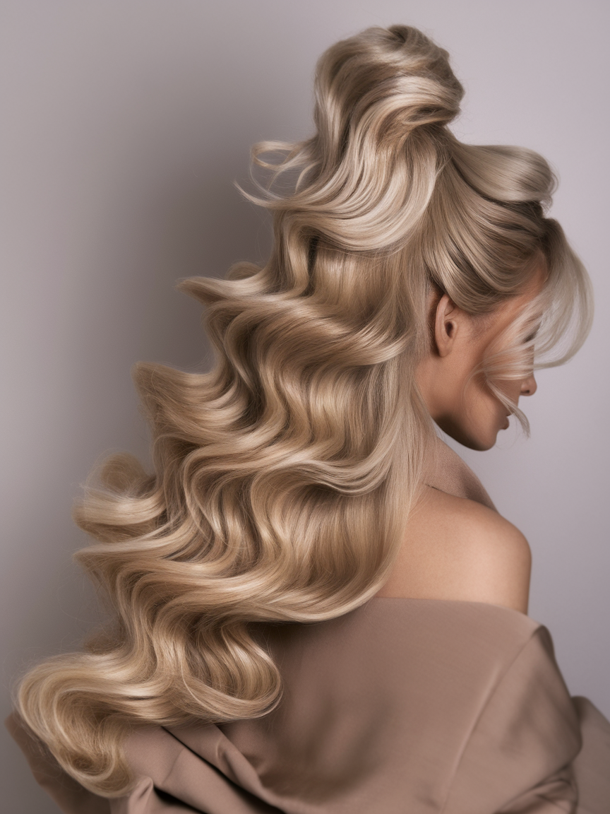This modern and trendy 2025 hairstyle features extra voluminous waves with a half-up twist, creating a luxurious and elegant effect. The warm blonde balayage enhances the depth and movement of the hair, making it a perfect spring hairstyle for women over 30. The soft face-framing strands add a touch of femininity, making this look ideal for oval and round faces. This trendy and glamorous style is perfect for special occasions or an everyday chic look.