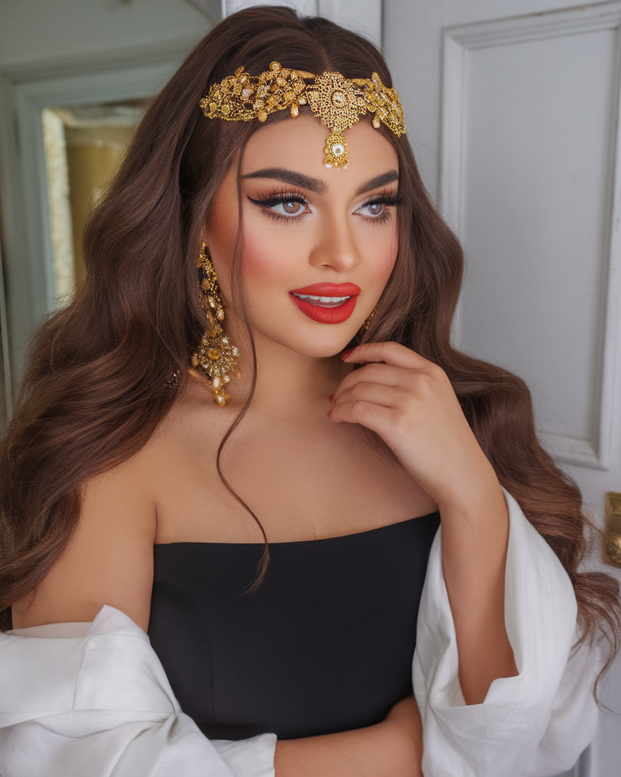 #4 Rich Brunette Waves with a Statement Gold Headpiece