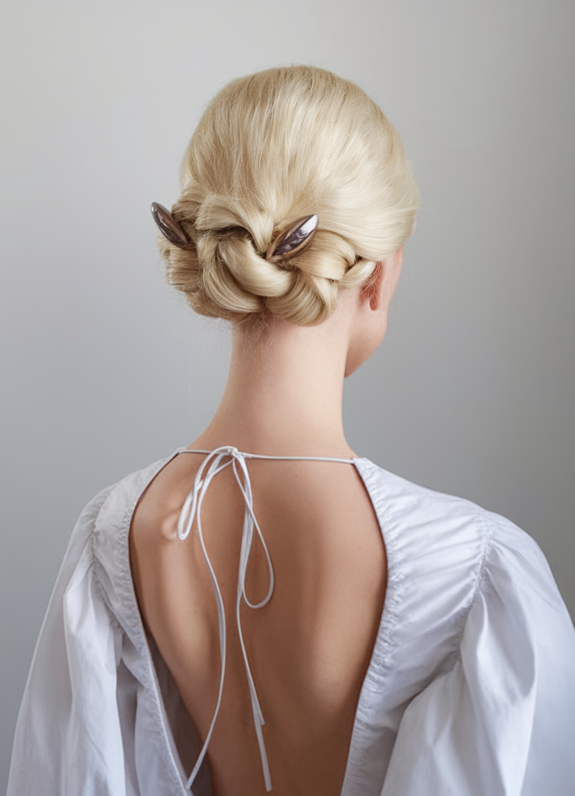 A chic and timeless hairstyle, this low twisted bun offers a polished and sophisticated look for women over 30. The cool blonde hair color enhances the structured yet soft appeal of this trendy spring hairstyle. Metallic hair clips add a modern touch, making this style ideal for both everyday and formal occasions. The low bun complements oval and round faces, providing an effortless yet elegant option.