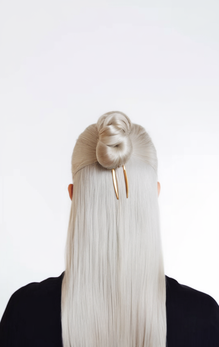 A trendy, modern take on the half-up bun, this spring hairstyle for 2025 is sleek yet stylish. The icy platinum blonde color gives it a bold, fresh appeal, making it one of the best hairstyles for those wanting a statement look. The neatly twisted bun at the back adds sophistication, while the smooth long locks maintain elegance. This easy hairstyle is great for both casual and formal occasions, making it a go-to for women over 30.