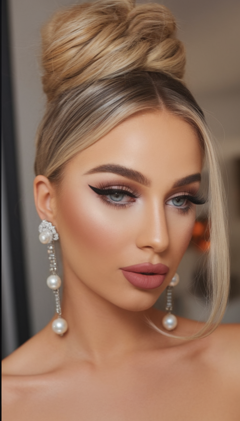 This spring 2025 hairstyle is a glamorous updo, ideal for special occasions or modern everyday elegance. The blonde hair with dark roots gives it a natural, dimensional effect. The loose strands softly frame the face, making it a flattering choice for round faces. This trendy updo adds height and sophistication, making it one of the best choices for a refined and effortless look.