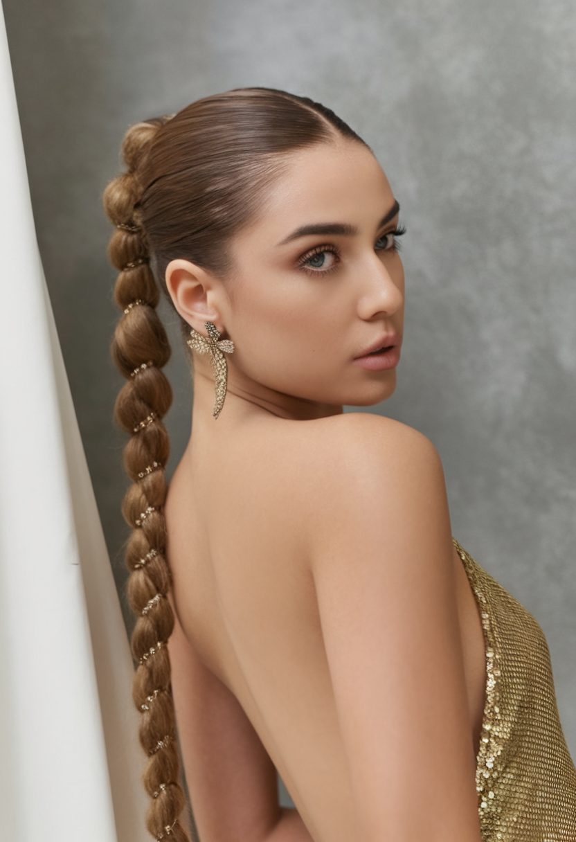 This modern and trendy hairstyle features a long, sleek ponytail intricately braided for a polished yet stylish effect. The rich brown tone enhances the shine, making it a perfect choice for spring hairstyles for women over 30. Small gold embellishments woven into the braid add a glamorous touch. This trending 2025 hairstyle is ideal for oval and round faces, offering a structured yet effortless appeal.