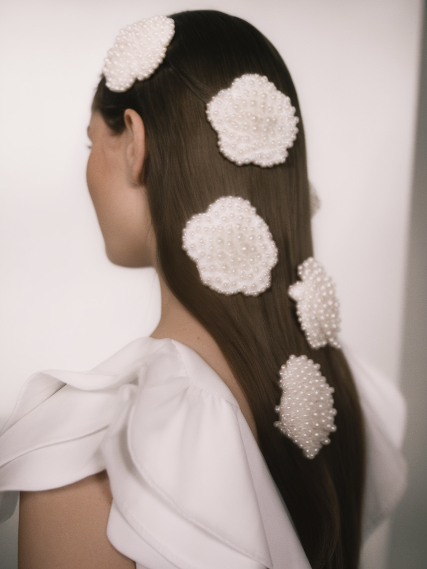 A long and sleek hairstyle with pearl embellishments brings a refined, elegant touch to 2025 spring trends. The smooth, dark brown hair serves as the perfect base for oversized pearl accents, creating a unique and modern look. This style is perfect for women over 30 who want to add a bold, yet sophisticated statement to their everyday or event-ready hairstyles. The minimalist structure allows the accessories to stand out, making this a trendy and stylish choice.