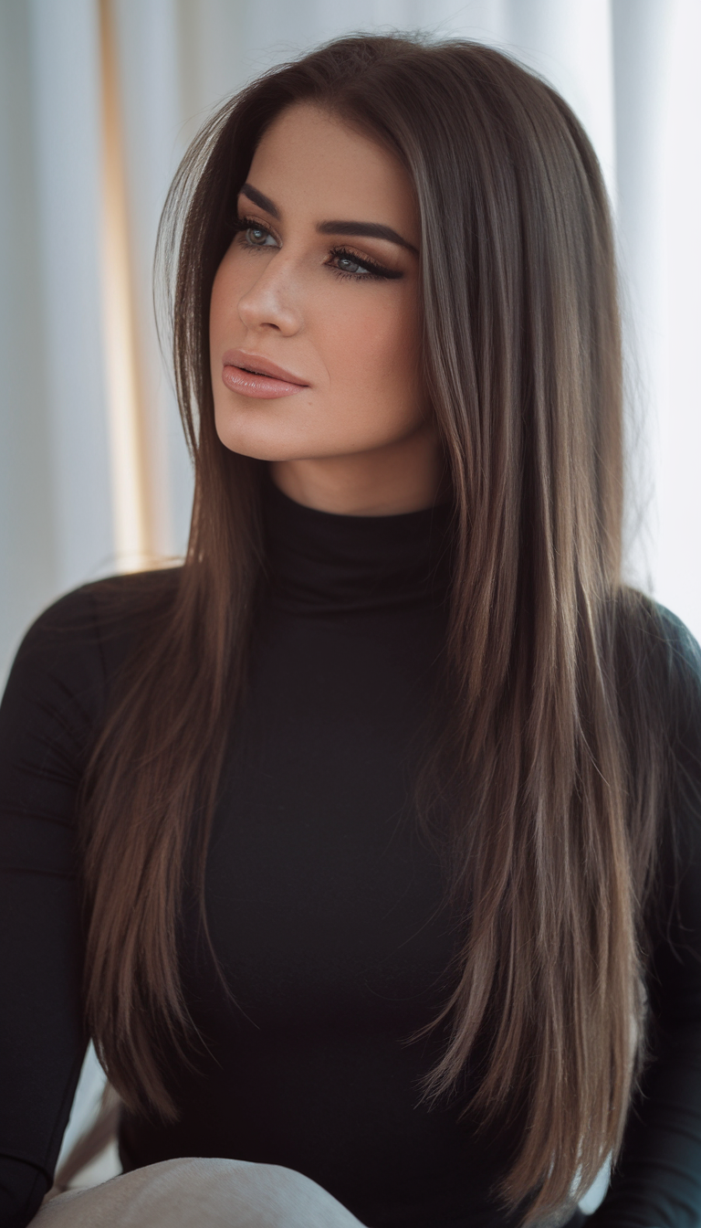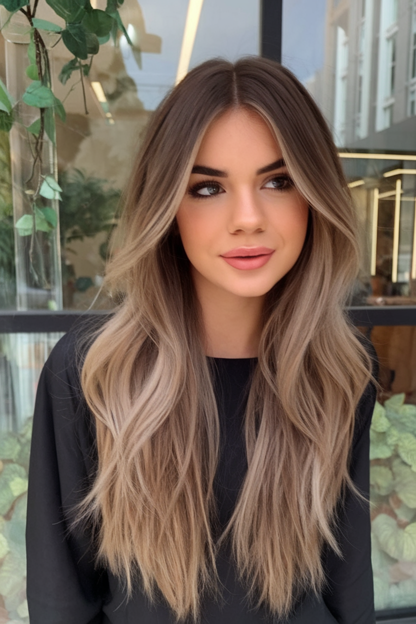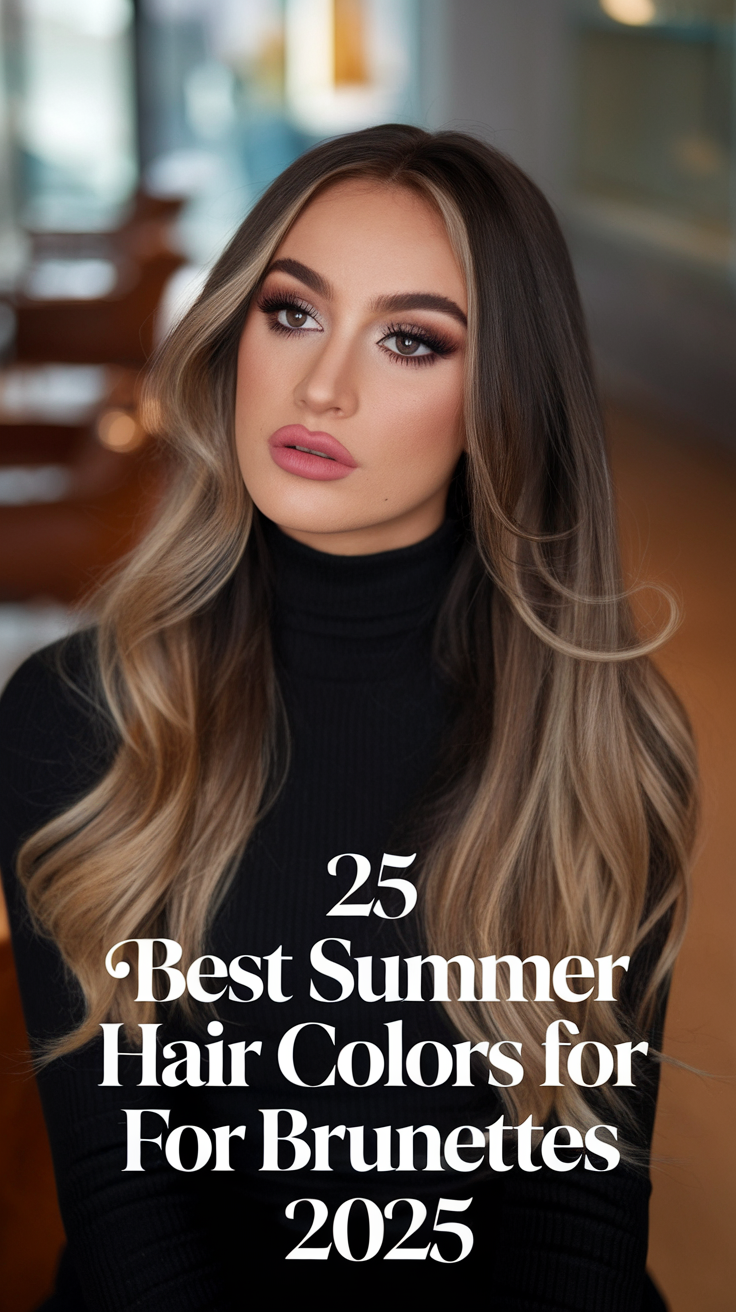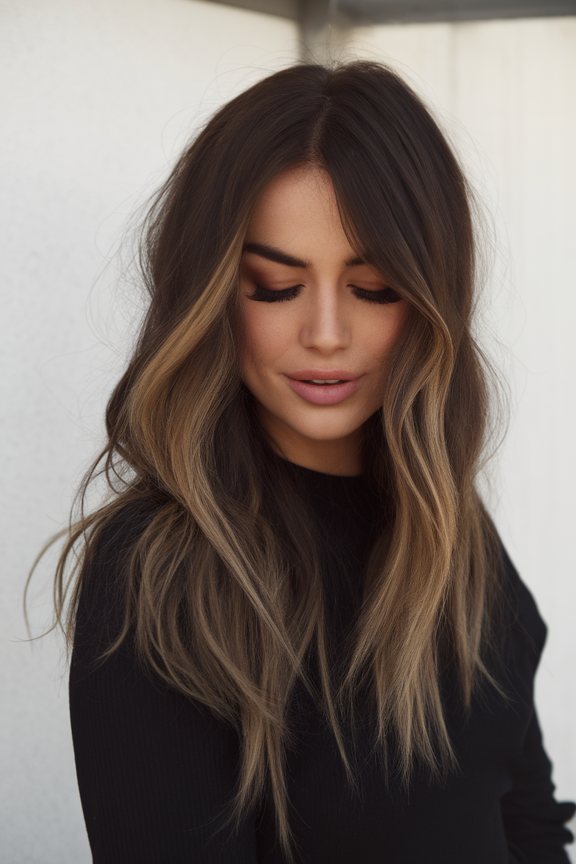 This long, layered style combines dark brown roots that gradually transition into soft, cool champagne highlights. Elegant dimensions result from the gradual transition that occurs between the roots and the ends, which avoids harsh contrasts. This color transition is part of the Best Summer Hair Colors for Brunettes 2025 category, which is designed for those who want subtle brightening effects. Soft, face-framing lightness is one of the most pleasing ideas for brunettes who want to soften their look.