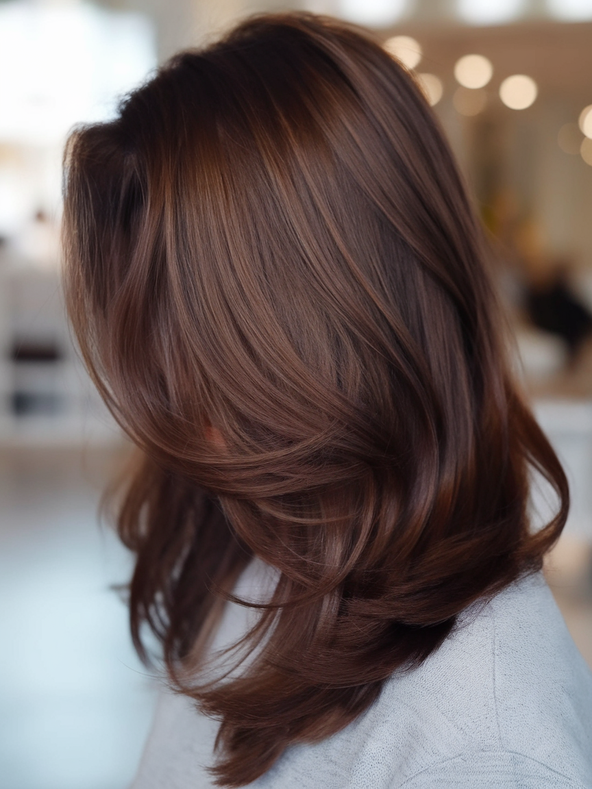 The classic brown hue is perfectly balanced with soft waves complemented by sweeping bangs in this charming yet everyday-friendly look. This brown shade adds depth to the base color while remaining submissive to its original tone. The shoulder-length layers create interesting movement that matches different facial features. People who want a warm and soft look in their style often choose this particular hair color.