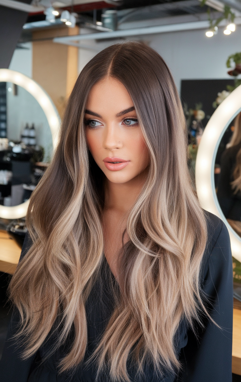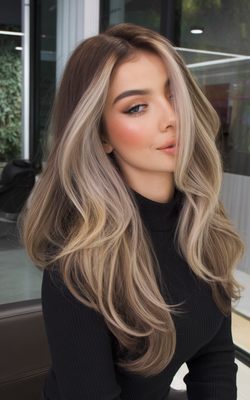 This hairstyle features a smooth dark base that transitions into soft ash blonde highlights that extend from the natural root of the hair. The long, soft sections of hair create facial definition while maintaining movement that keeps the natural hair texture flowing. People who need subtle definition without dramatic color contrast will find this beautiful choice among the Best Summer Hair Colors for Brunettes 2025. Such a color scheme is one of the leading choices brunettes use when transitioning to blonde hairstyles.