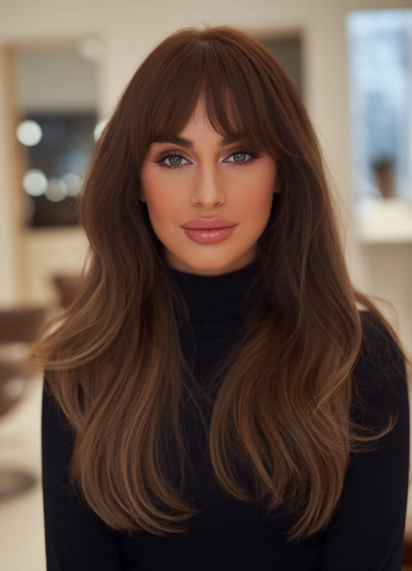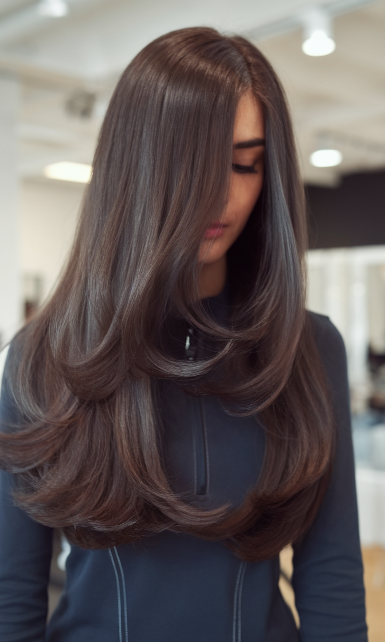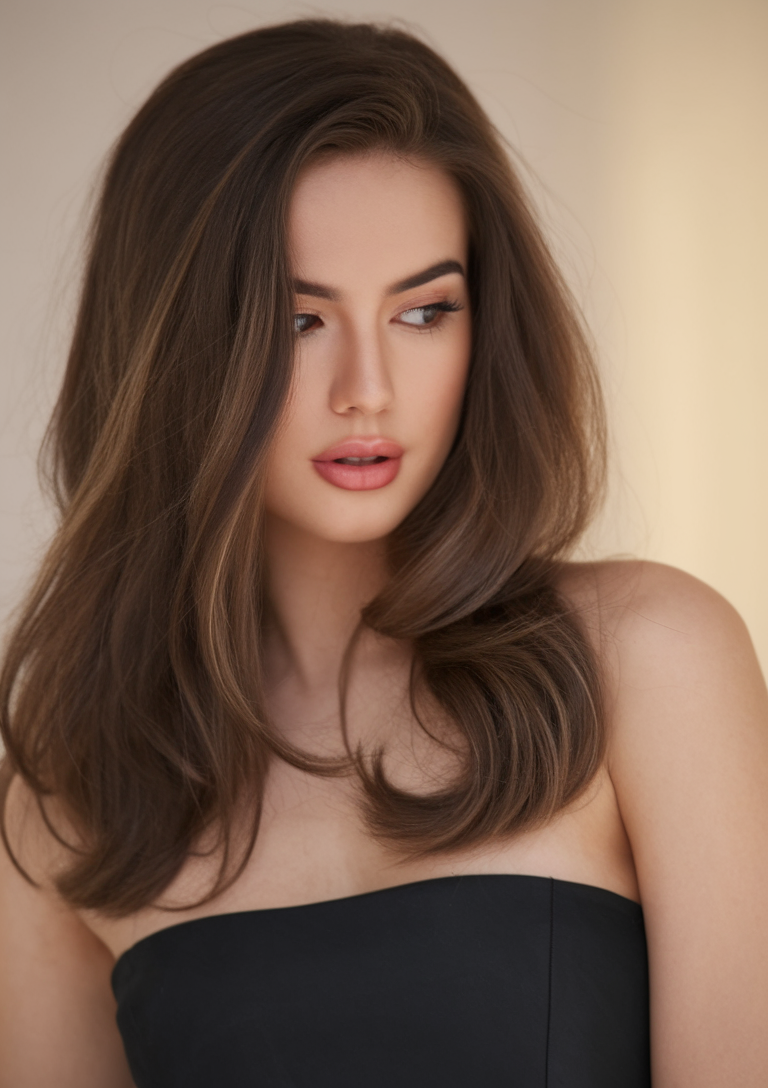 This custom style features sleek waves and a glossy finish with highlights in a dark chocolate brown color. The voluminous styling adds natural movement to the hair, which beautifully accentuates medium to dark brown hair tones. The style is a leading option in the Best Summer Hair Colors for Brunettes 2025 trends because it adds sophisticated depth. Summer brunettes with long layers show exceptional beauty when they adopt this particular hair color tone.