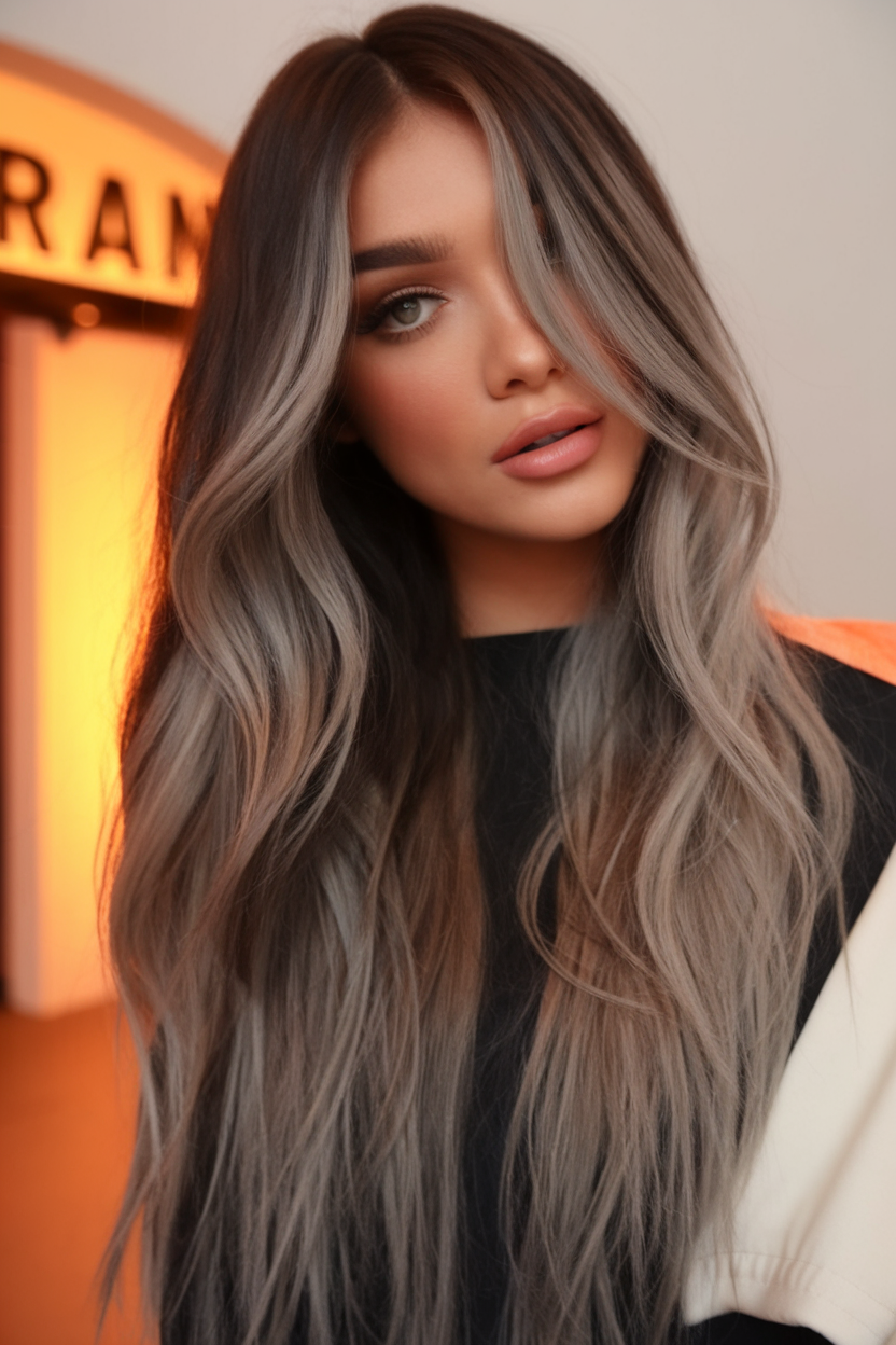 Dark brunette is the base of this style before cool smoky balayage with a silver sheen appears in between. The angled cut of the layers within the style helps the metallic color move gracefully, giving it dimension and a sleek appearance. A modern color change leads the Best Summer Hair Colors for Brunettes 2025 selection because it meets the needs of those who like bold contrasts between hair tones. The style creates a fashion-forward look suitable for brunettes who want a dramatic summer transformation.