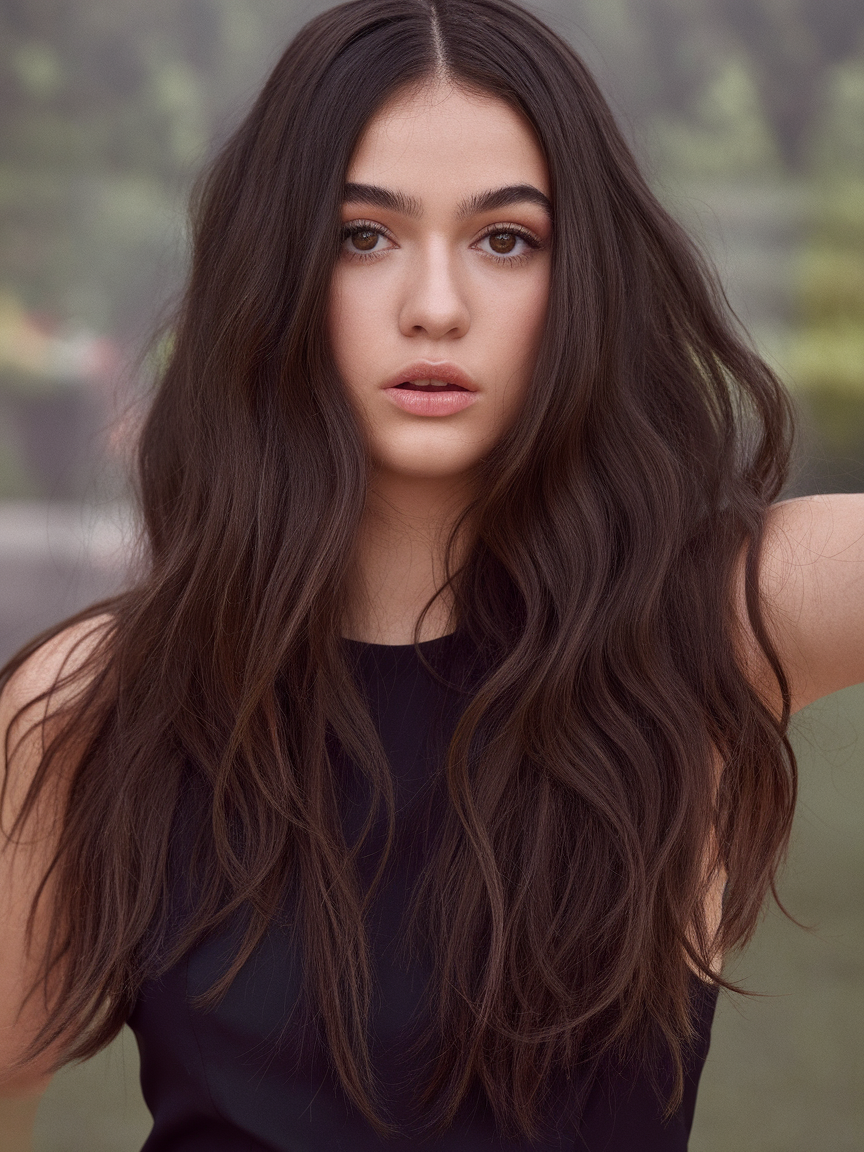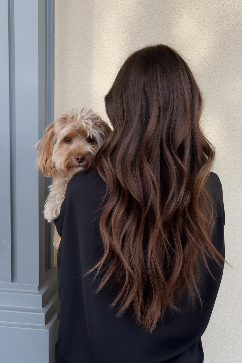 Long, loose waves with dark chocolate brown highlights and subtle caramel lowlights define this look. Soft ribbons combined with the dark base create vibrant movement while maintaining the balance of the natural color. Brown-haired individuals looking for sophisticated touches should consider this as an elite style option in the brown spectrum. This color’s delicate sophistication has earned it a reputation as a top choice for the 2025 Best Summer Hair Colors for Brunettes.