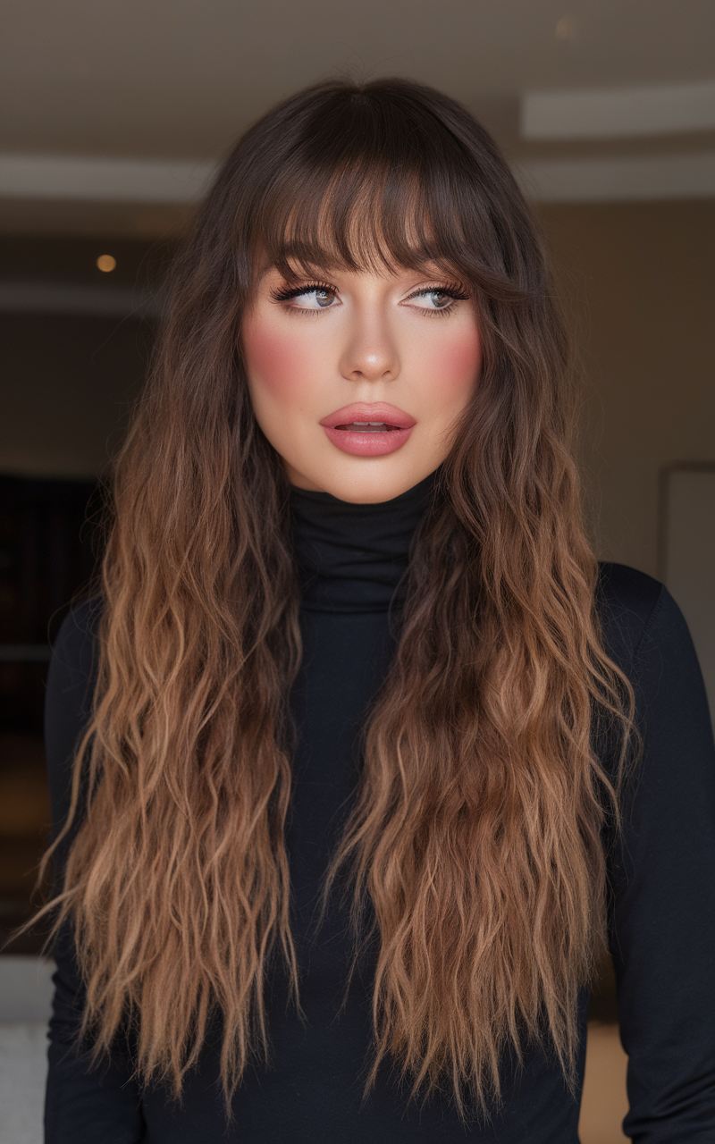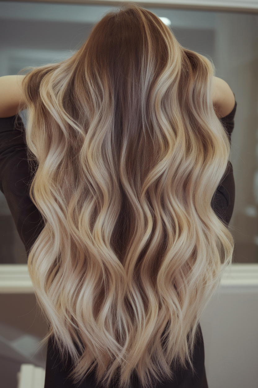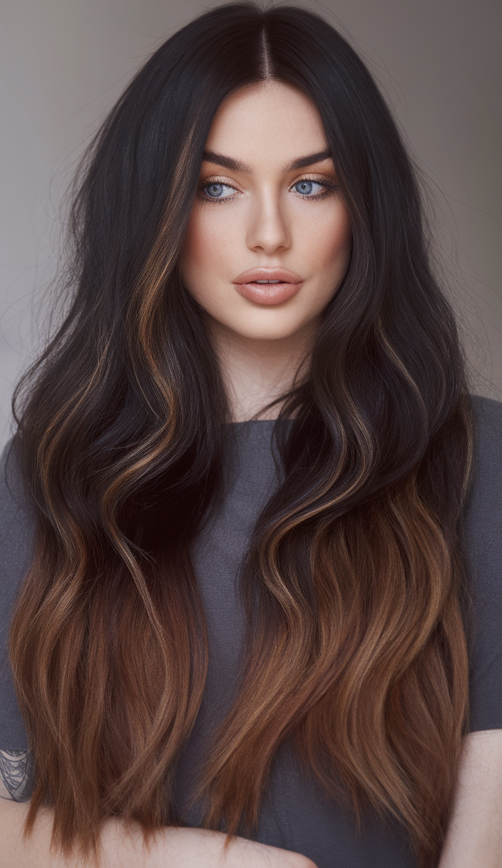 This look features beautiful, full-length waves as the balayage highlights gently fade into the shorter bottom sections. The dark color at the roots creates depth, while the lower lengths naturally blend into caramel lowlights that add warmth and movement. The color complements coarse hair textures and gives a perfect summer appeal that works great for late summer scenes. For brunettes who want to effortlessly refresh their long hair, this type of look remains one of the easiest color choices.