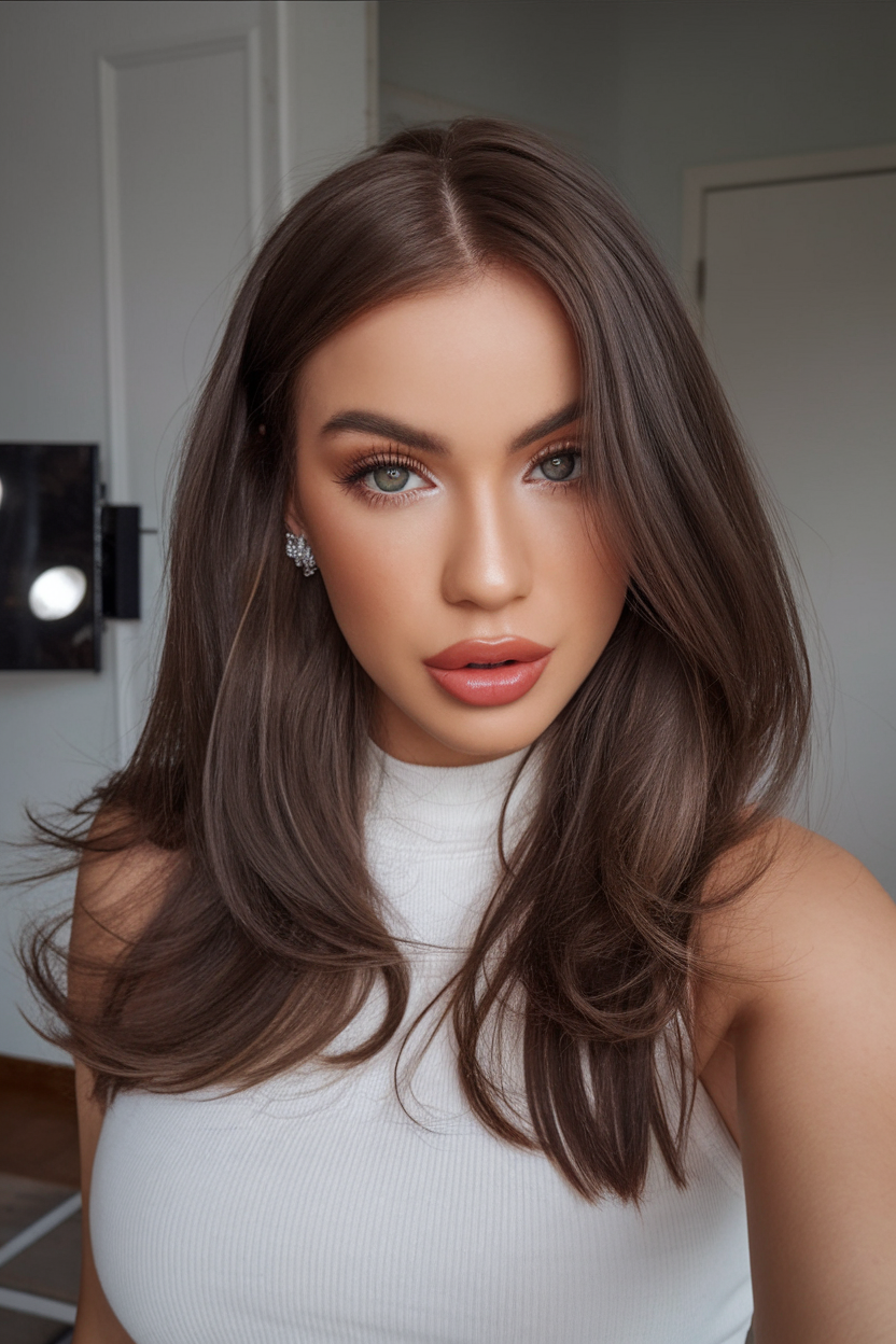 This style showcases rich, medium-length hair with carefully placed layers to create both body and movement. Placement within the brown color palette results in a subdued effect through low lighting combined with gentle tonal shifts that create an elegant and delicate result. This color option suits women with brown hair who are looking for understated updates that add dimension to their summer look. People looking for natural brightness should consider this option, which is one of the best summer hair colors for brunettes in 2025.