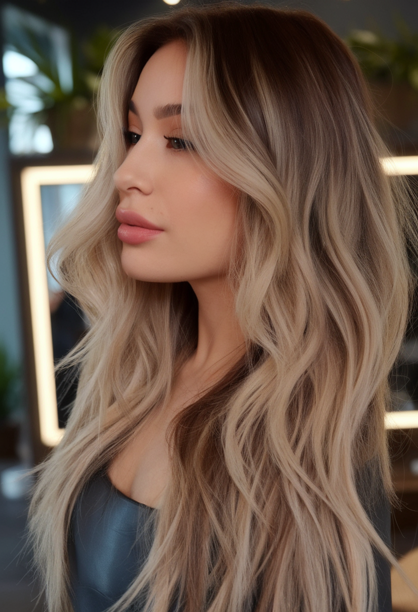 Soft, light blonde waves merge perfectly with dark roots that blend into cool tones to create an ideal look for those who love balayage styles. The seamless interweaving of different tones allows the hair to create a sophisticated summer shine to achieve a sophisticated end result. The combination of deep and light colors near the roots creates one of the best looks for women who want to maintain depth while still showing off their blonde hair. One of the best summer hair options for brunettes in 2025, this distinctive combination blends modernity with timeless elegance.