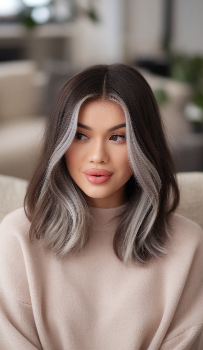 Bold, fresh shoulder-length hair has bright silver streaks running through the facial area. Black hair on the rest of the head provides a strong contrast that brings out distinct facial features. This two-tone coloration emerges as an interesting, edgy choice within the Best Summer Hair Colors for Brunettes 2025 list. This haircut offers both a detailed look and striking styling effects for those who want to stand out.