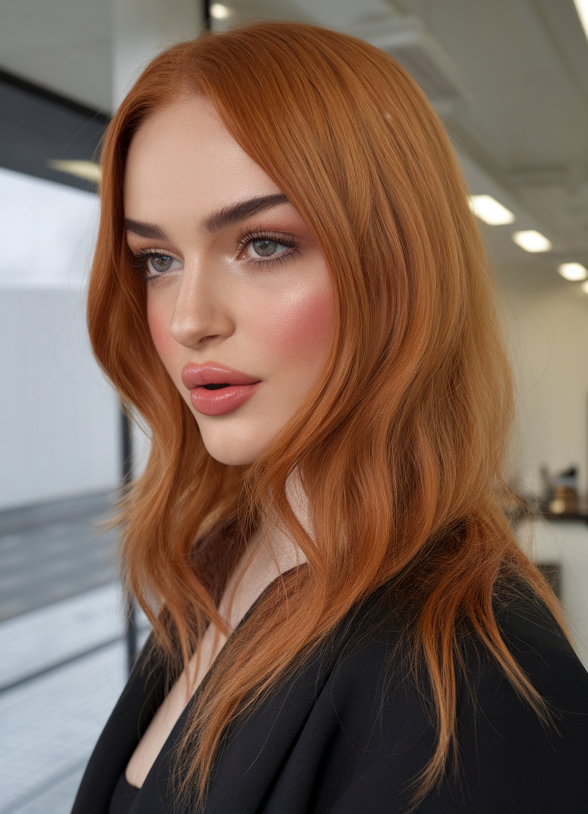 This soft auburn shade is a trendy spring 2025 choice for medium-length brunettes, blending warm brown with golden highlights. The natural waves enhance the sun-kissed glow, making it perfect for a youthful yet elegant look. This style complements trends for women over 40 seeking a modern yet timeless touch.