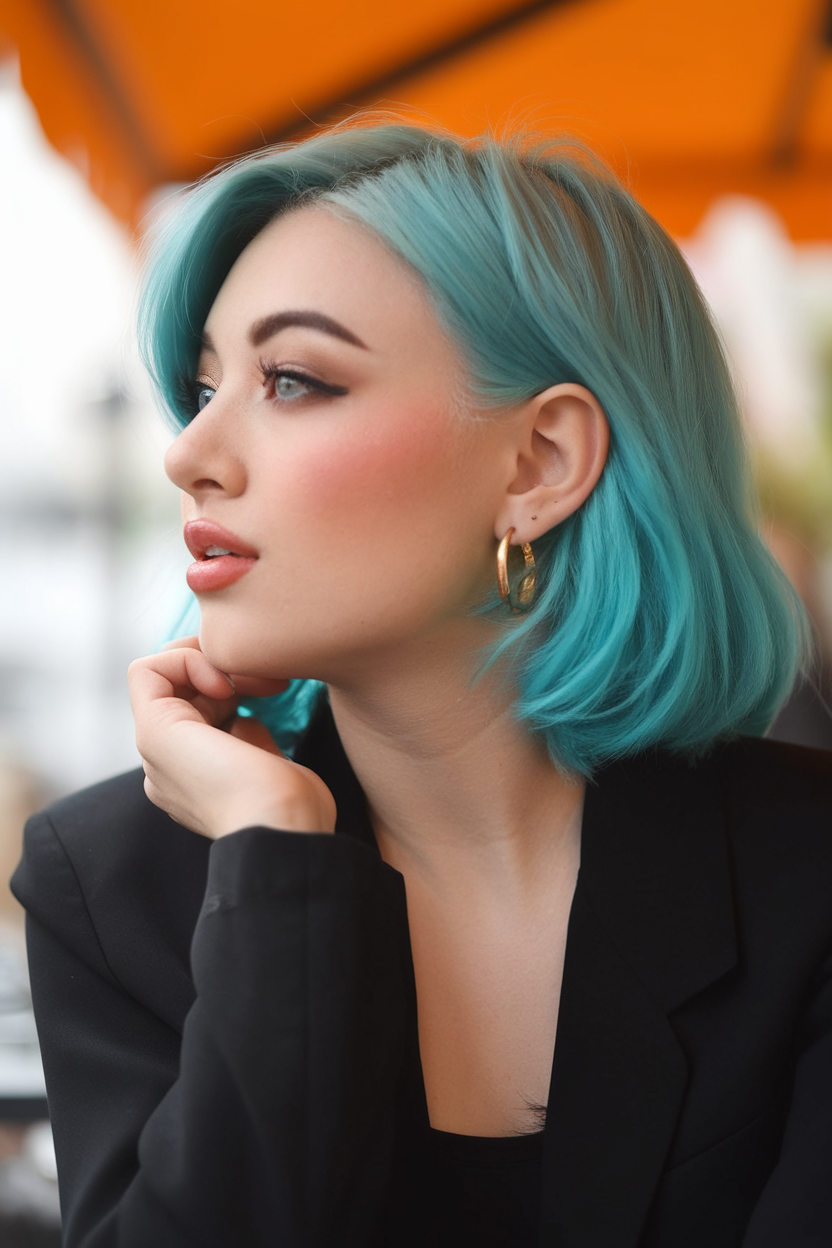 The vibrant teal bob captures the essence of trendy spring 2025 ideas, with its bright and playful tone. The chin-length cut is sleek and polished, emphasizing the bold color for a contemporary style. It’s a statement look perfect for those exploring trends for women brunette with creative flair.