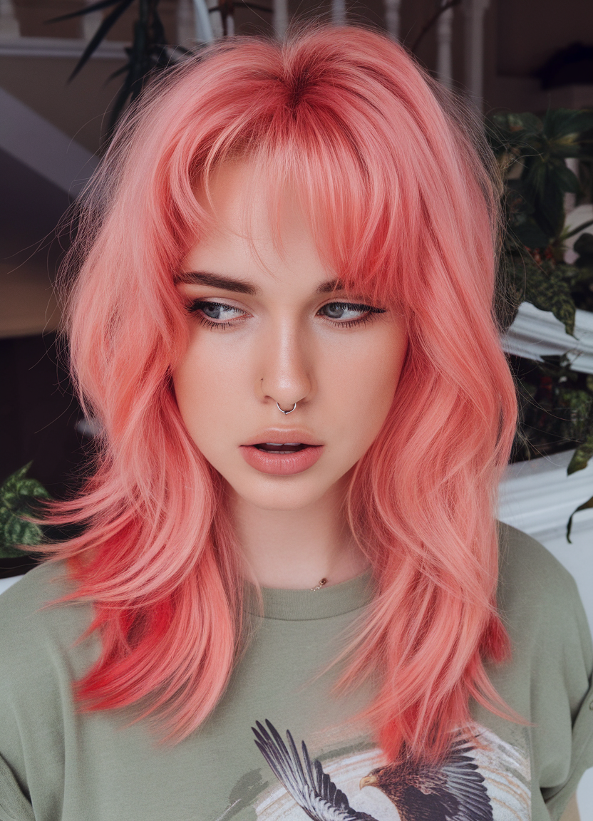 This soft coral shade paired with layered waves and curtain bangs is a fresh take on trends for brunettes transitioning into bold spring tones. The textured layers add movement, while the curtain bangs frame the face beautifully. It’s a youthful and fun choice for spring 2025 trends focused on lighter, vibrant colors.