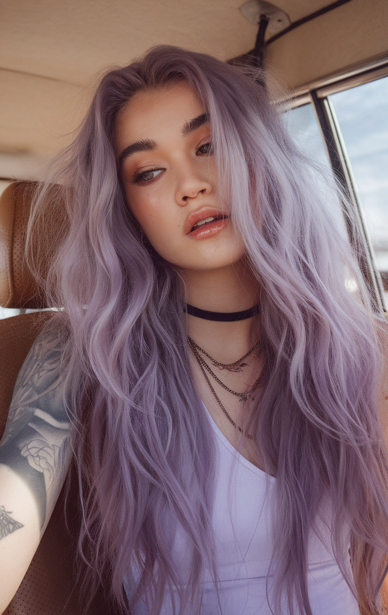 This flowing pastel lavender hairstyle embodies spring 2025 trends, with its soft, voluminous waves creating a whimsical and ethereal look. The light purple tones add a delicate touch, making it ideal for trends brunette styles transitioning into brighter, softer palettes. This look is perfect for long, carefree layers that emphasize effortless elegance.