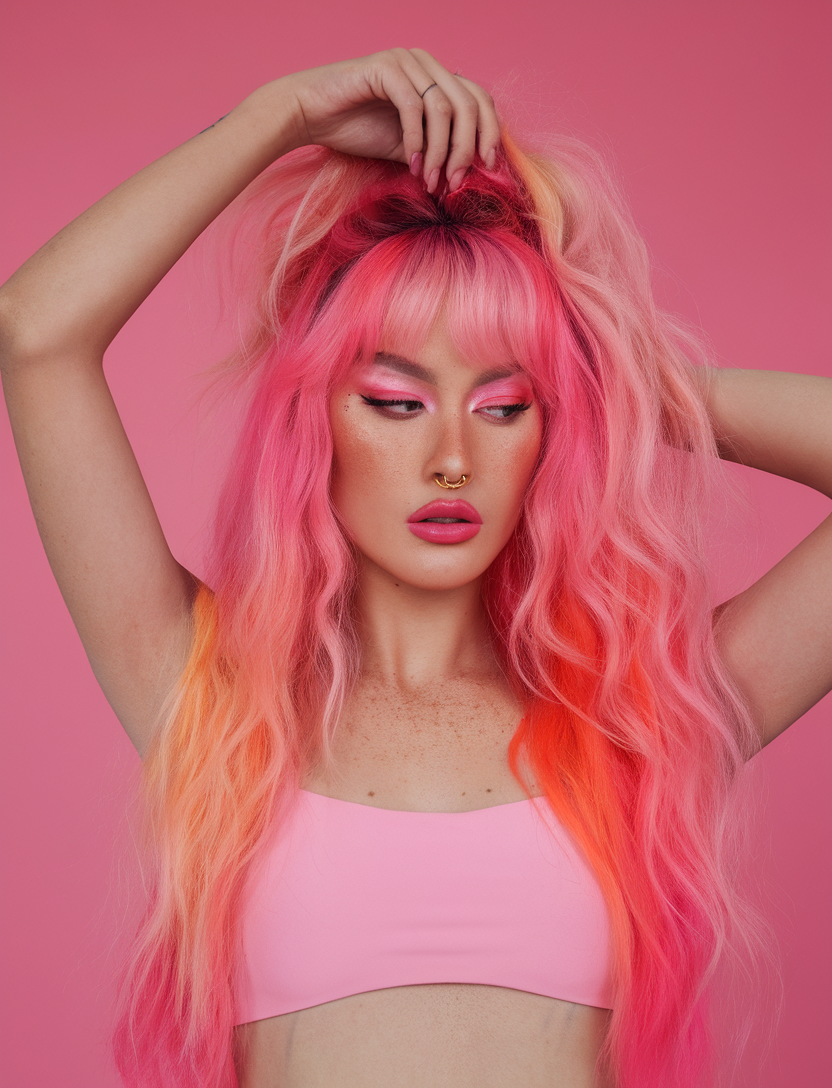 This bold neon ombre combines bright pink and fiery orange tones, making it a standout choice for trendy spring ideas. The voluminous waves and playful bangs enhance the vivid colors, perfect for anyone embracing bold trends 2025 brunette with blonde highlights. It’s a dramatic yet fun style for those who love to turn heads.