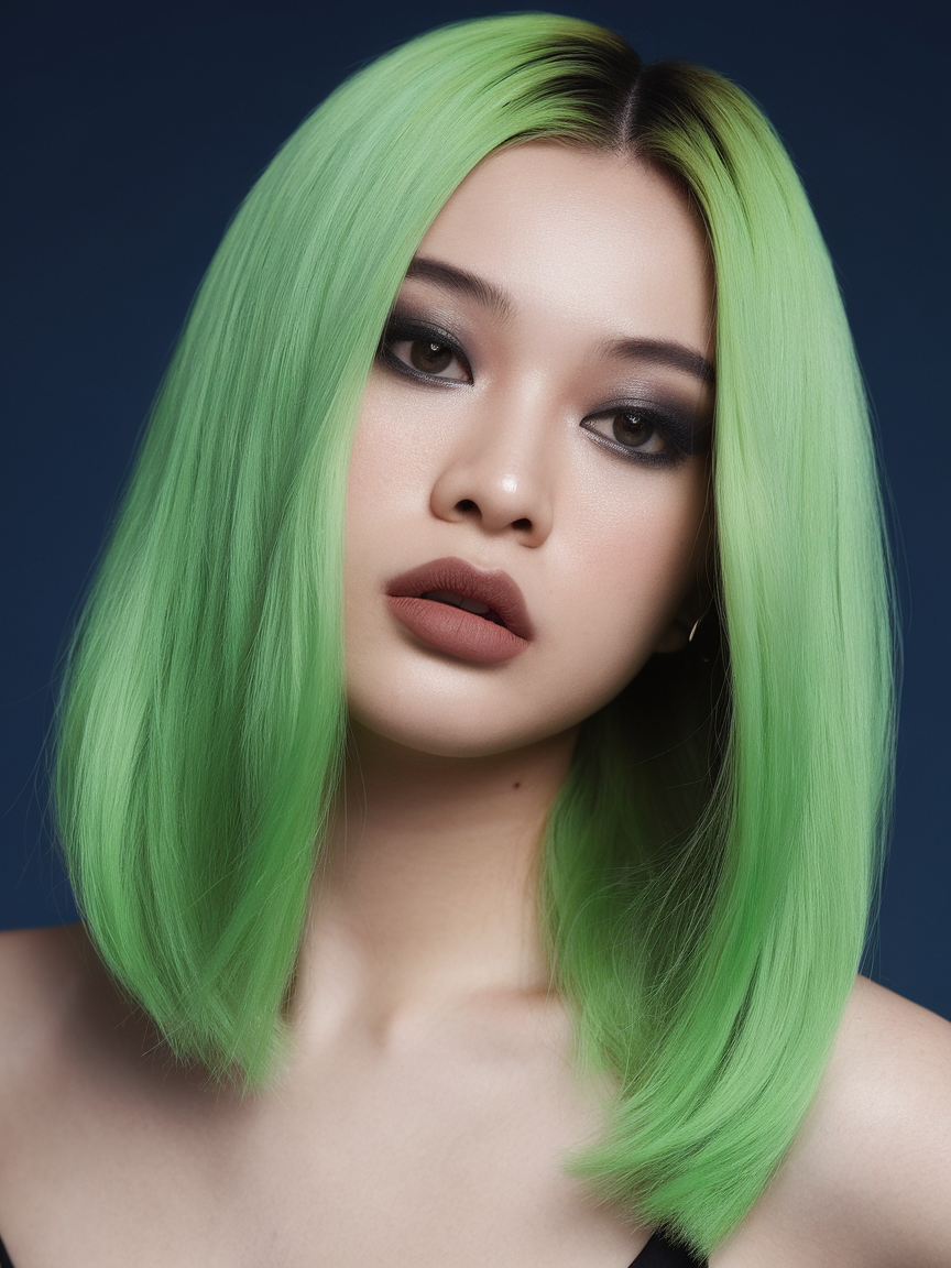 This sleek lime green lob brings vibrancy to spring 2025 trends, with its smooth finish and bright, eye-catching hue. The sharp, precise cut emphasizes the boldness of the color, perfect for those embracing trendy spring palettes. It’s a daring choice for medium-length styles seeking high-impact results.