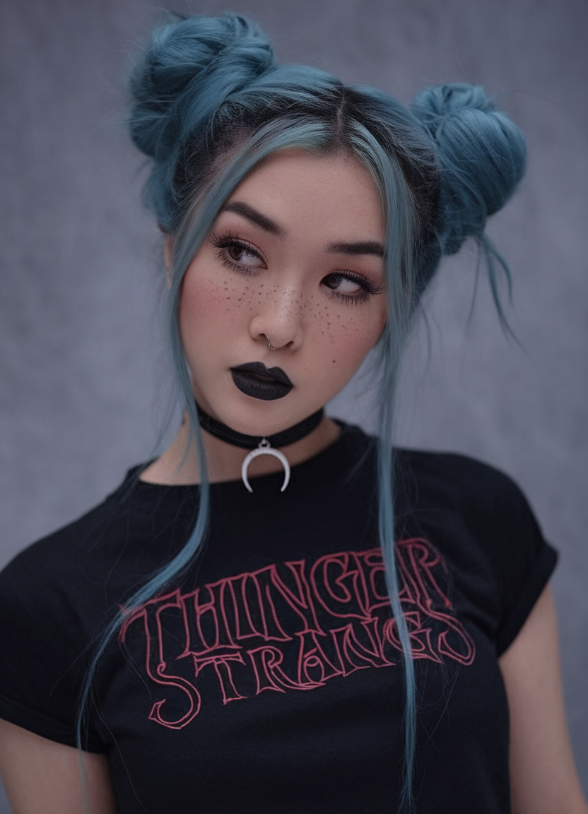 This playful hairstyle features textured blue space buns paired with sleek, face-framing strands for a modern twist on trendy spring ideas. The deep teal tone highlights the creative styling, making it ideal for bold, fun looks. It’s a great choice for trends 2025 brunette hair transitioning into striking fantasy shades.