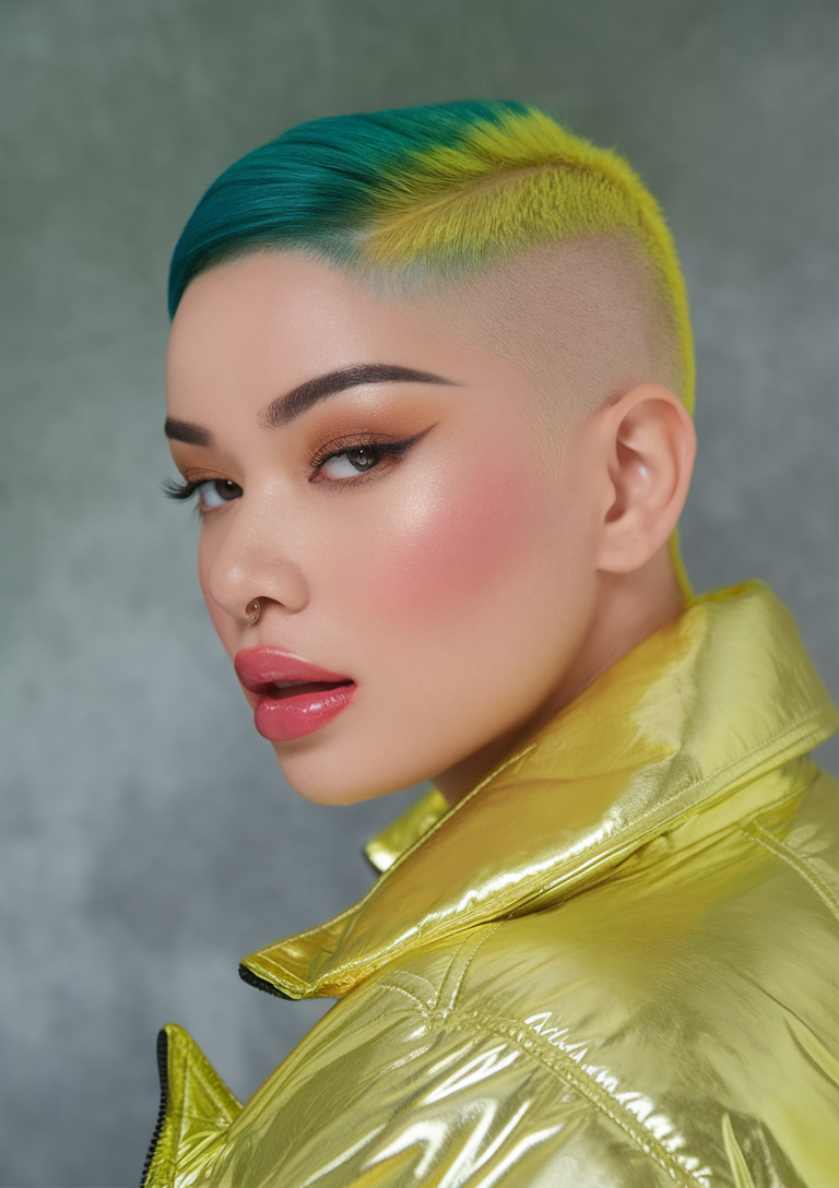 This bold undercut combines a deep teal top with neon yellow accents, making it a standout in spring 2025 trends. The sharp contrast between the colors and the shaved sides adds a daring edge to this ultra-modern look. It’s ideal for anyone seeking bold trendy palettes with high impact.