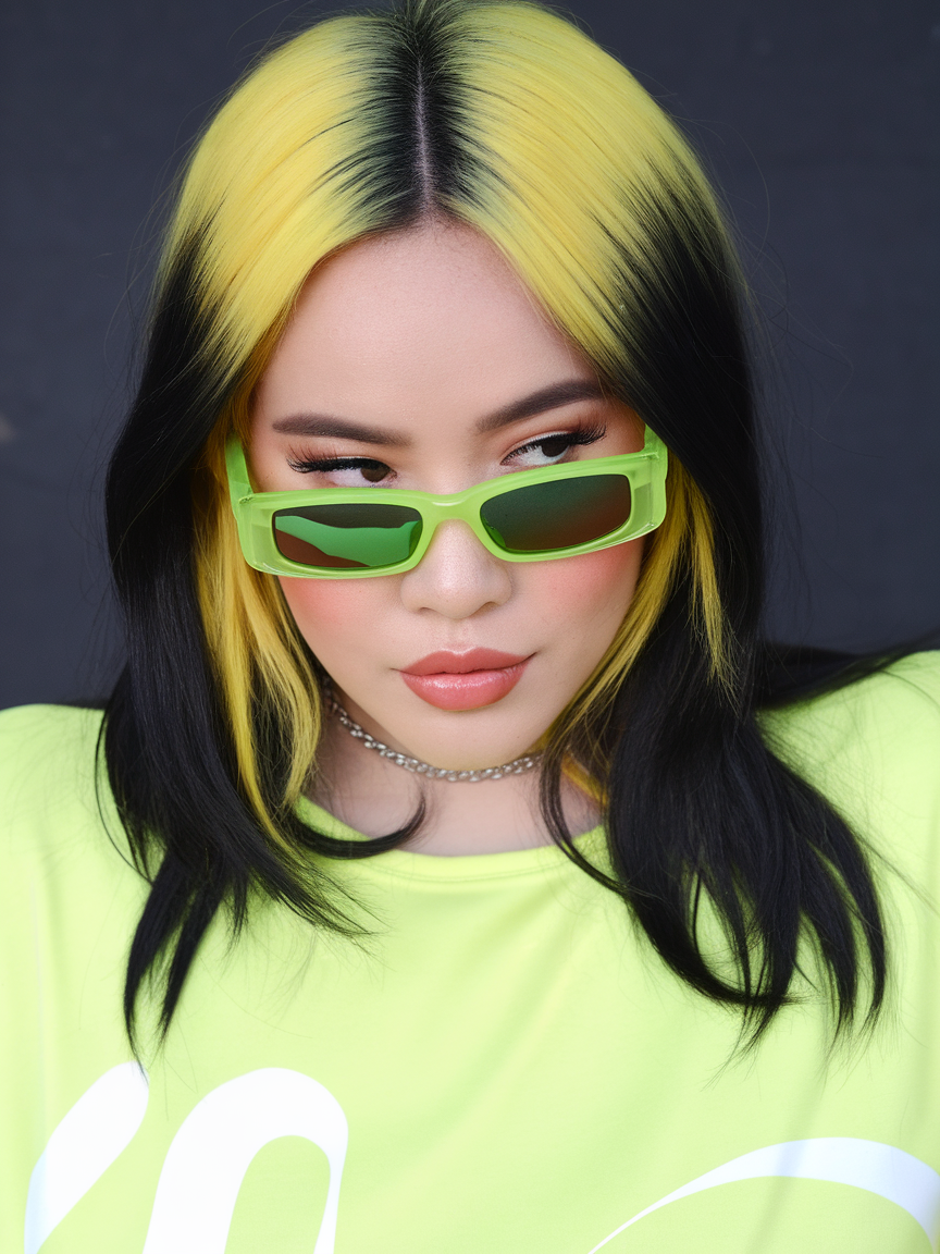 This split-dye hairstyle pairs vibrant yellow with jet-black roots, creating a striking and dramatic contrast. The sleek, medium-length cut keeps the focus on the bold colors, perfect for those exploring trendy spring 2025 ideas. This look is both edgy and sophisticated, making it a versatile choice for daring styles.