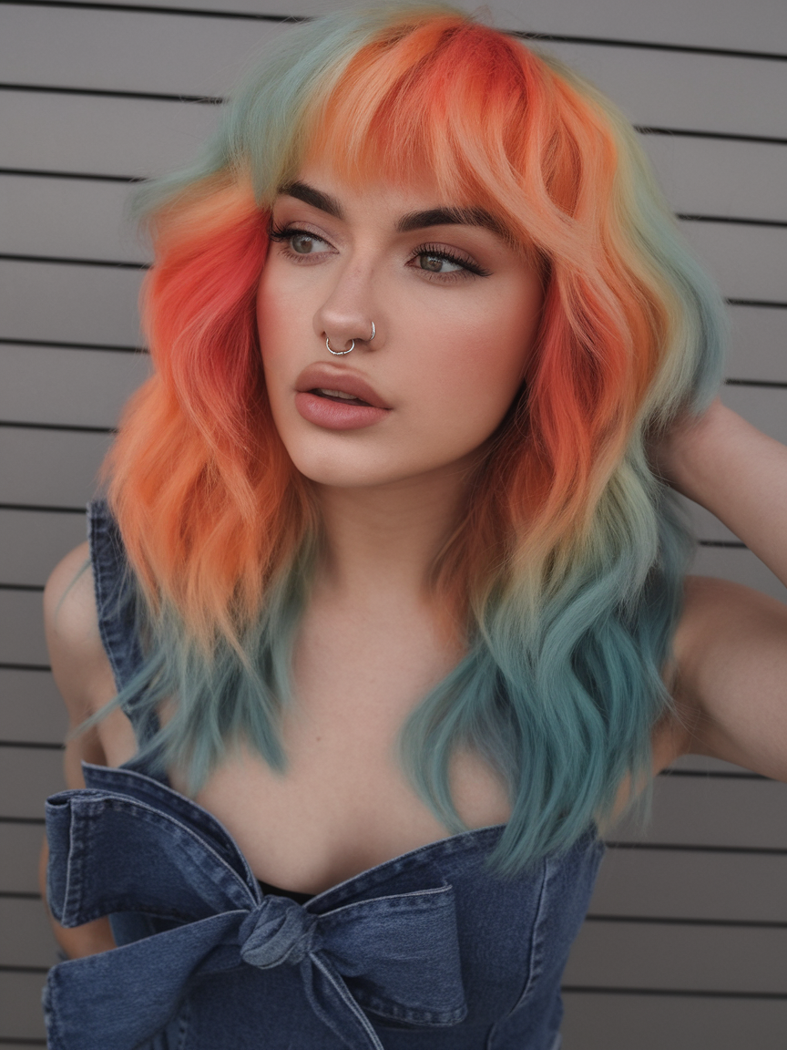 This colorful style blends fiery orange, soft yellow, and teal blue tones, mimicking a beautiful sunset. The wavy texture and subtle layers enhance the vibrant palette, making it a perfect example of trends for women brunette with a creative twist. This lively look is ideal for medium to long hair seeking bold, colorful transformations.
