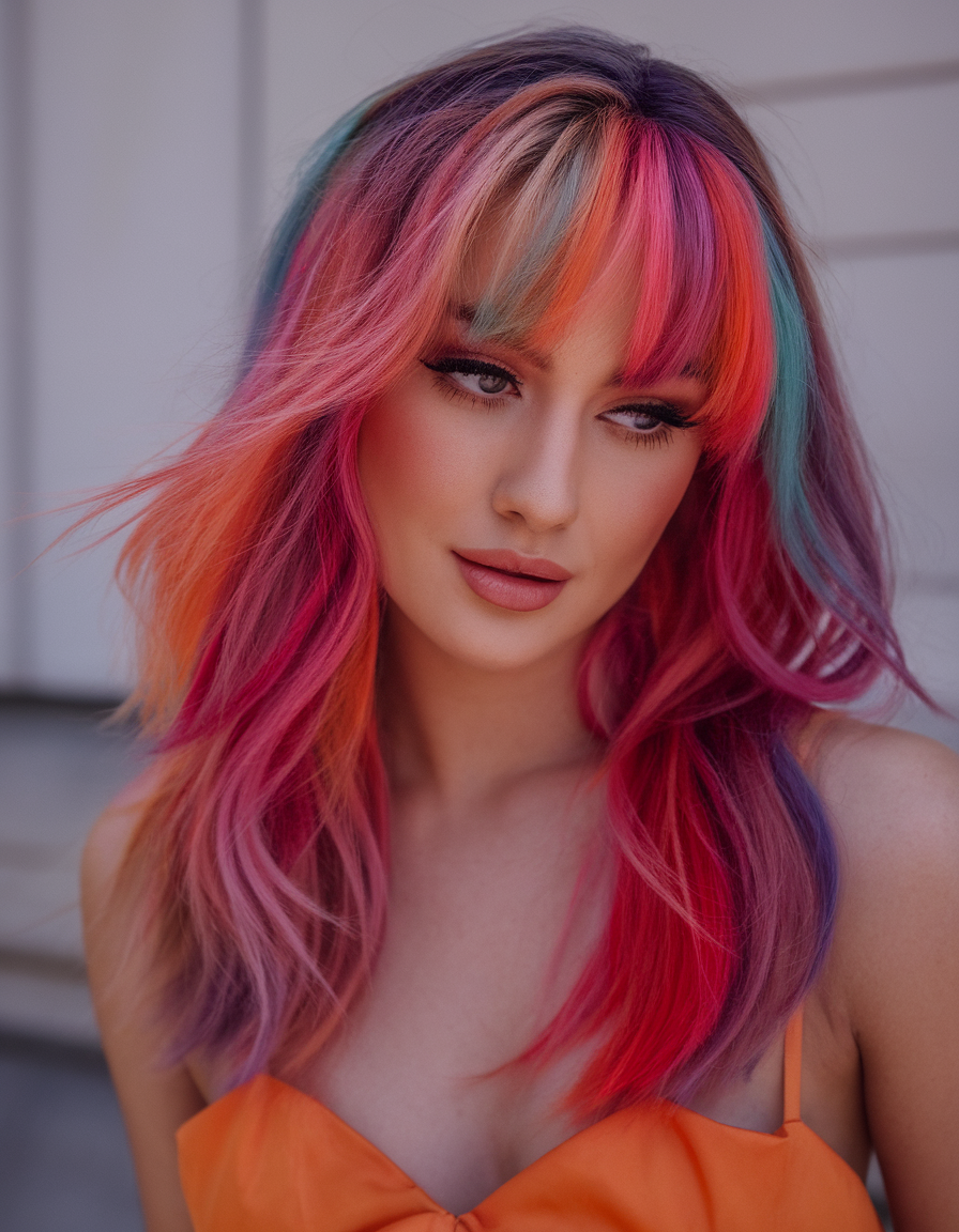 This hairstyle features an eye-catching blend of pink, orange, and purple shades, creating a dynamic multicolor effect. The soft bangs frame the face beautifully, while the layered medium-length cut adds natural volume and movement. It’s a bold choice for those seeking a playful and artistic look.