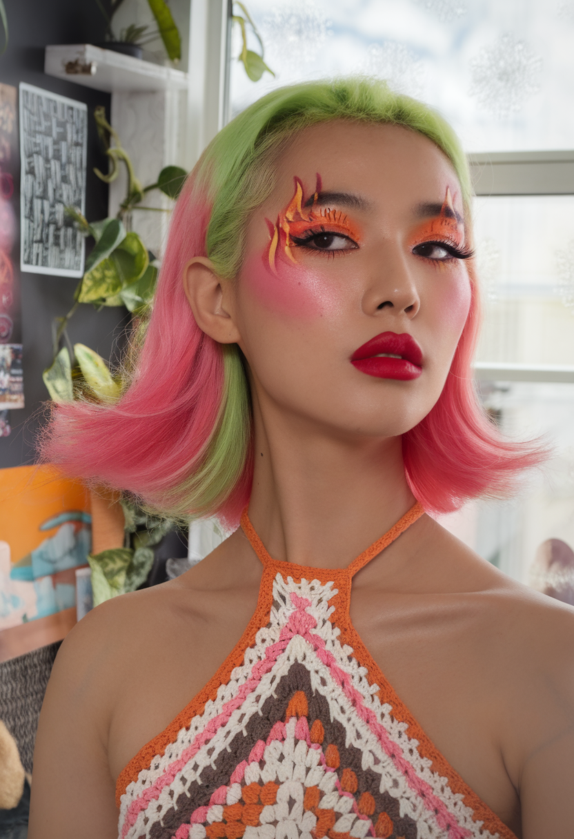 This striking bob combines neon pink and green hues, with the hair slightly flipped outward at the ends for a retro-inspired style. The smooth finish and vivid contrast make it a statement look, perfect for trendsetters. The blunt cut enhances the sleekness and sharp color separation.