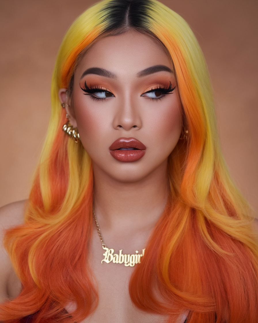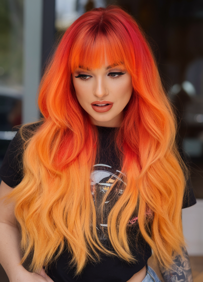 Radiant orange and yellow tones blend seamlessly in this long, wavy hairstyle, mimicking the hues of a sunset. The thick fringe emphasizes the bold color gradient, while the soft waves create a romantic and ethereal vibe. This style is ideal for making a dramatic, yet elegant, impression.