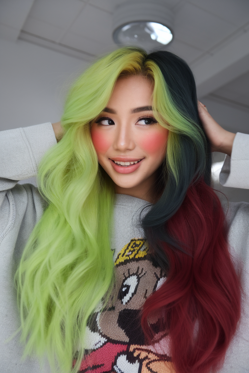 This striking hairstyle features two-toned hair, with vibrant lime green cascading on one side and a rich, deep burgundy shade on the other. The long, wavy layers create an effortlessly voluminous look that highlights the bold color contrast. This daring style is perfect for anyone looking to make a bold, edgy statement.