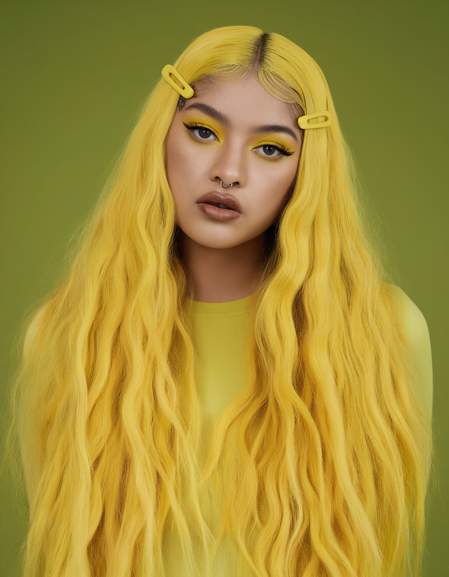 Bright yellow hair flows in long, soft waves, giving off a sunshine-inspired vibe. The center part is accessorized with matching yellow clips, adding a playful and youthful touch to the overall look. Perfect for a fun and bold style that exudes positivity.