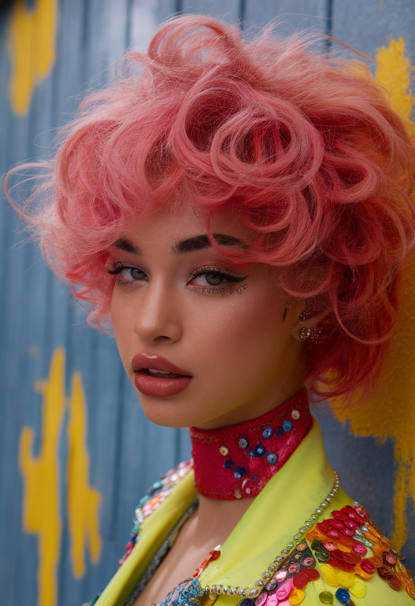 This playful pink hairstyle features soft, voluminous curls that bring a retro-inspired vibe to trendy spring 2025 looks. The tousled texture adds dimension, making it perfect for highlighting bright palettes and bold color choices. It’s a standout option for those embracing trends for women brunette who want to explore lighter, creative shades.