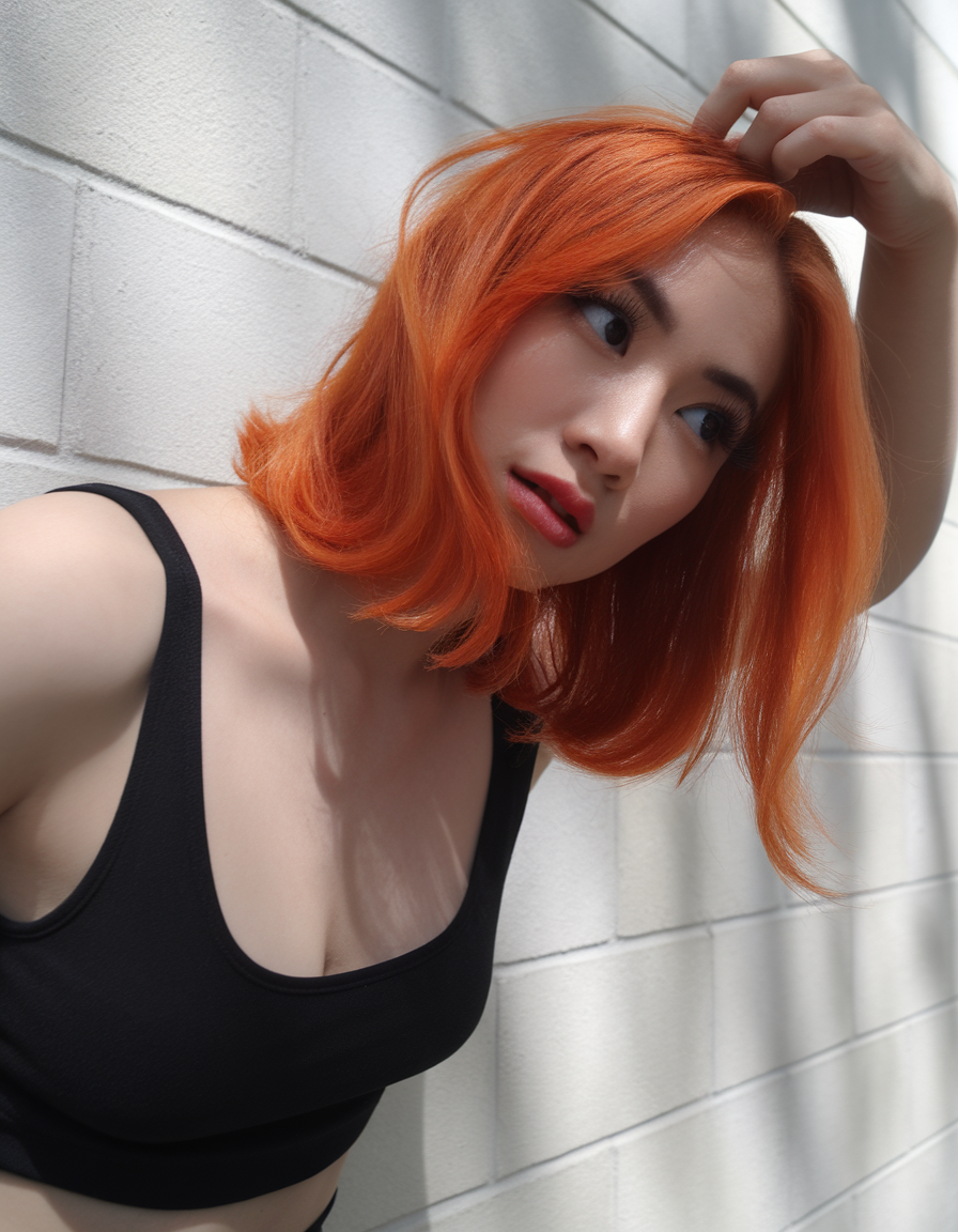 The bright orange lob pairs a classic medium-length cut with a sleek, smooth finish, reflecting trends for brunettes stepping into vibrant shades. The bold color radiates energy, making it ideal for spring 2025 ideas. This style works beautifully for those exploring trends 2025 dark paired with sharp and precise cuts.