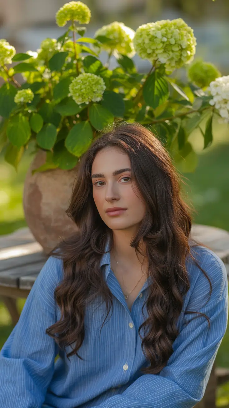 In this picture, the hairstyle is all about the easy-going beauty of long, luxurious waves of brunettes. The chocolate brown warm colors are perfectly combined with a slight touch of caramel highlights, which provide depth and dimension. The waves are also soft in nature and voluminous and this is to form a natural and beachy feel. The hair is softly cascading down below the shoulders, and has a parting in between that leaves the face with space to shine. The appearance is ideal when it comes to an individual who appreciates the I woke up like this appearance yet would like it to have a refined edge.