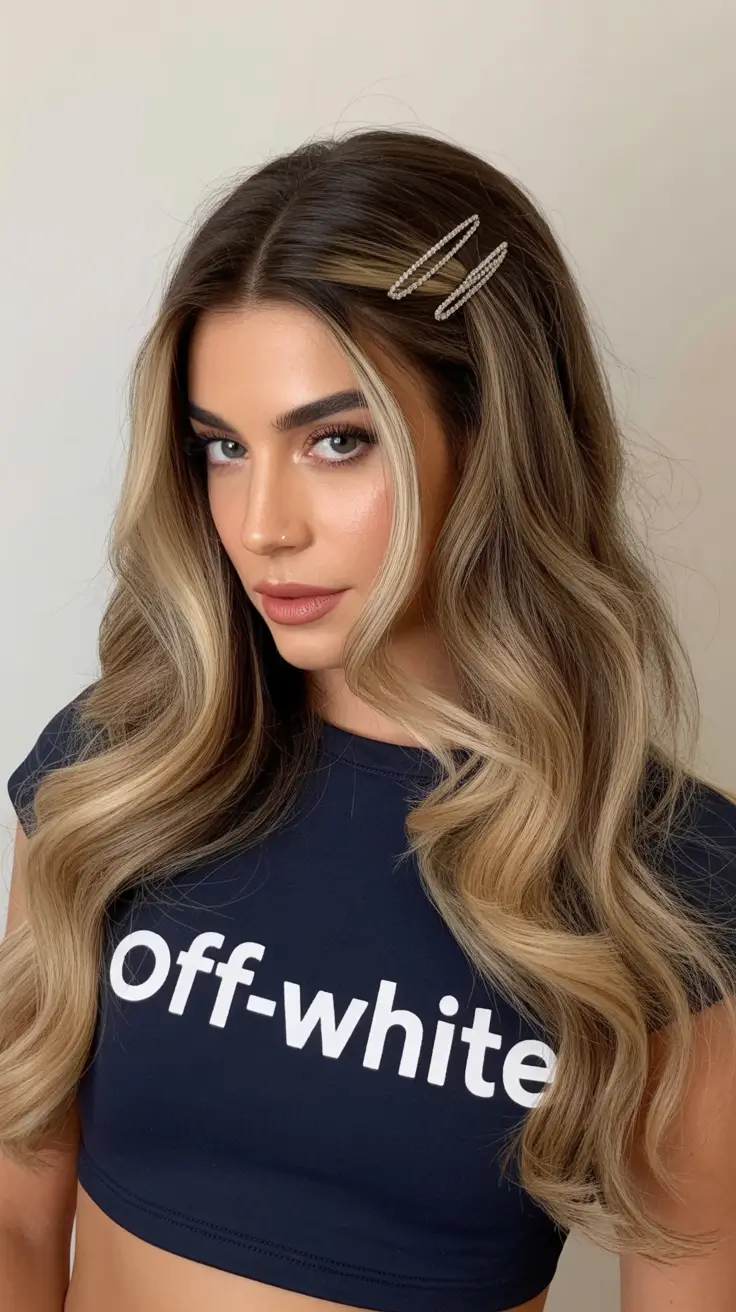 This soft and subtle appearance is a deep brunette base with a combination of soft blonde highlights. The caramel blonde shades blend in with the rich brown in a multi-dimensional appearance, which is not only appealing to the eye, but also natural. This hair makes this hairstyle very lively due to the waves and each curl frames the face very easily. The general appearance is bright and sophisticated and balances casual and elegant.