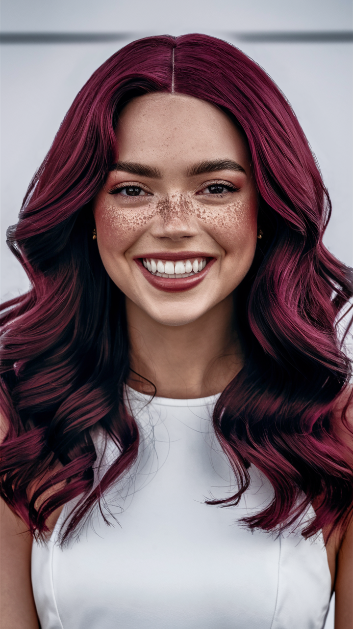 These glossy burgundy waves with a natural part create a chic, effortless look. The middle part emphasizes symmetry, while the vibrant berry tones add a touch of boldness.
