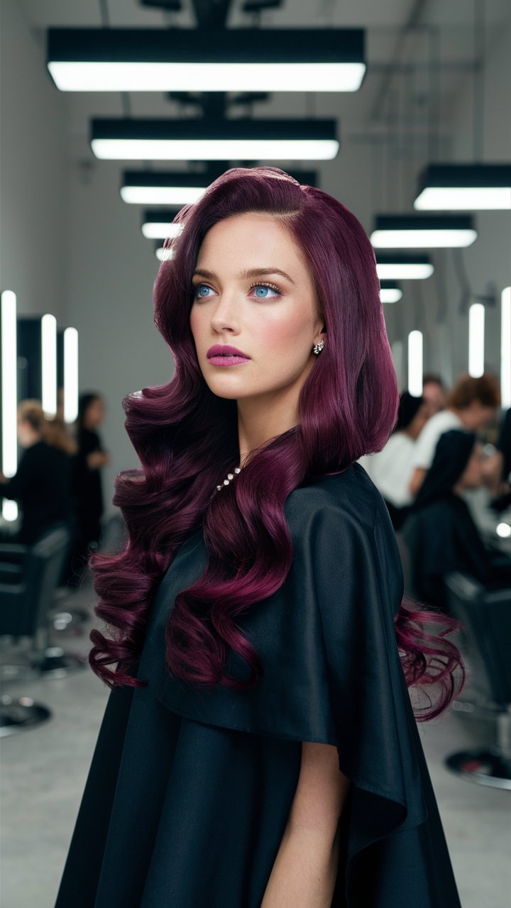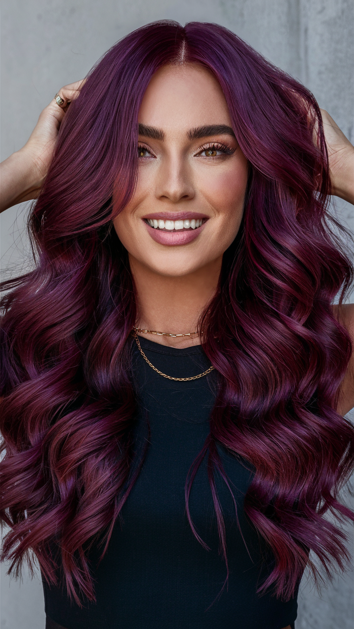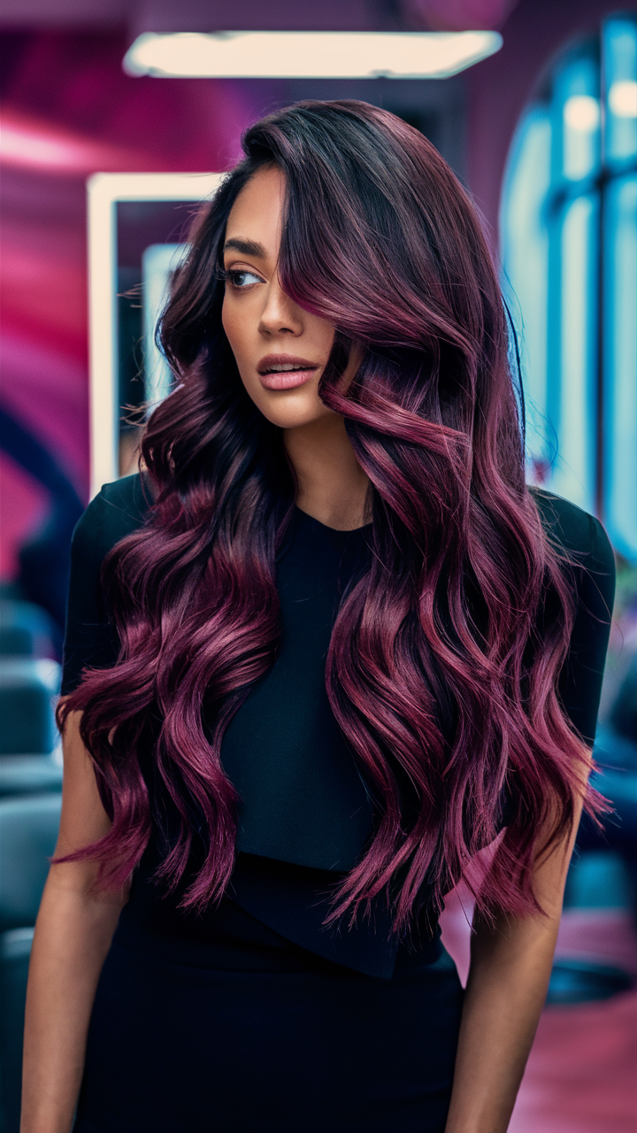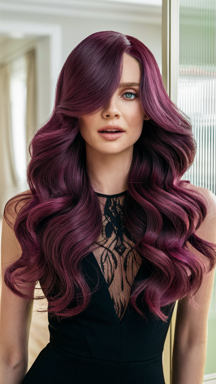 Flowing waves in a deep burgundy shade are accented with violet highlights, adding vibrancy and depth. The layered style enhances the hair’s natural movement for a glamorous finish.