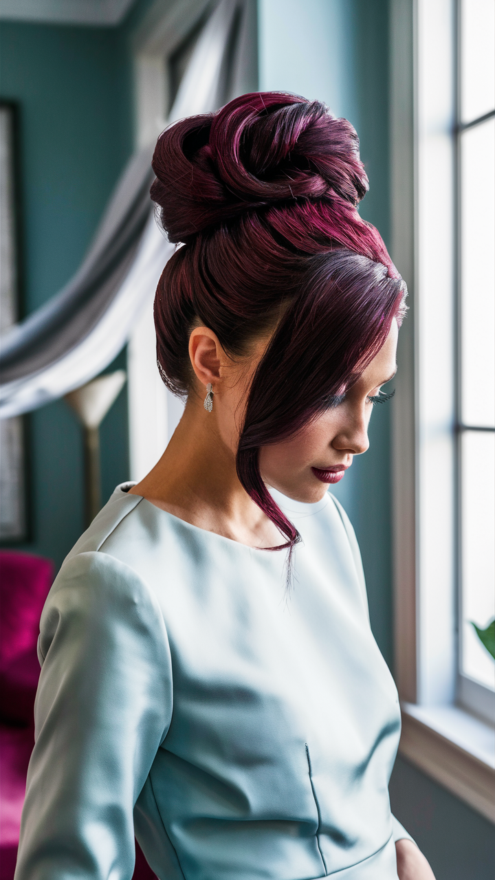 An elegant burgundy updo features a sleek side-swept strand for added softness. The intricate bun highlights the rich red tones, making it an ideal choice for formal or bridal occasions.