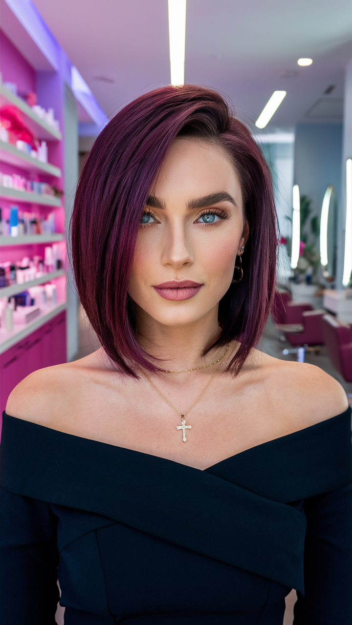 A sleek bob in plum-toned burgundy with a side part creates a polished, professional appearance. The smooth finish enhances the bold color, making it a modern choice for short hair enthusiasts.