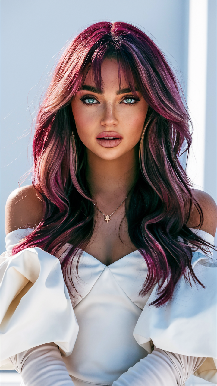 Long, flowing layers in deep burgundy with bright raspberry highlights create a youthful and edgy appearance. The bold face-framing strands add a modern twist to this classic style.