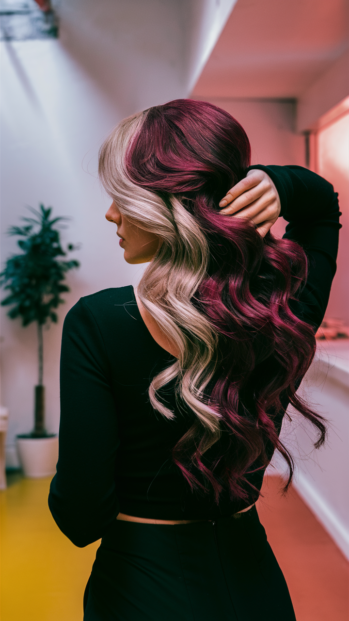 A burgundy balayage transitions seamlessly into light blonde highlights, creating an eye-catching contrast. The blend of dark red, chocolate, and cool blonde hues adds a modern edge. This style is a creative choice for anyone wanting a standout color transformation.