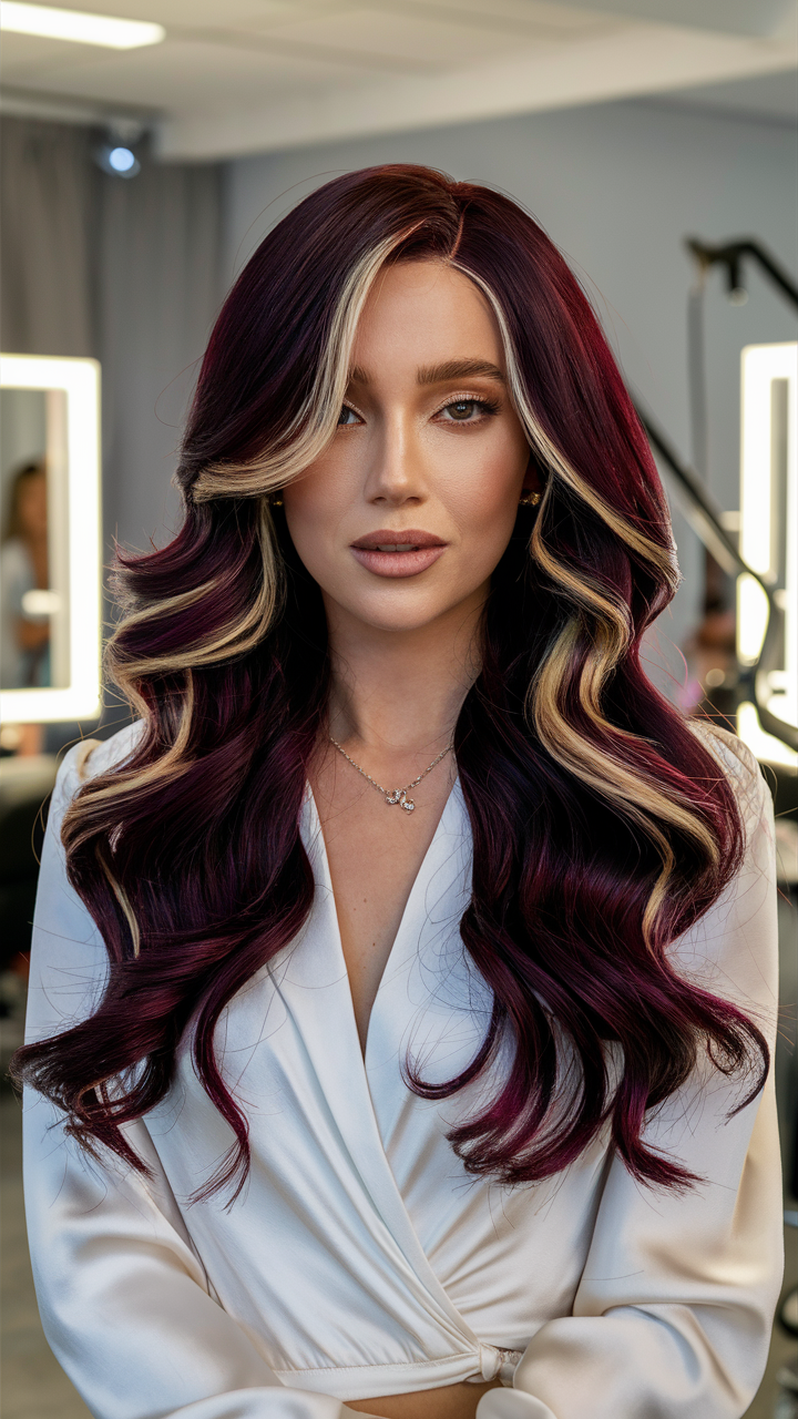 This look features rich burgundy waves enhanced by striking blonde streaks that frame the face. The blend of warm wine tones and cool highlights creates a stunning contrast. A chic and bold option for brunettes looking to refresh their style.