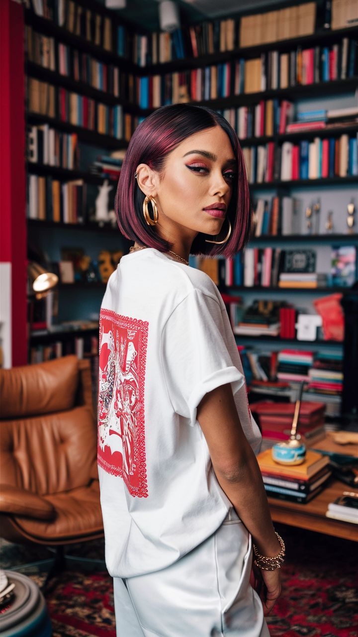 A sleek, straight bob infused with dark burgundy undertones and subtle highlights creates a polished, modern look. The sharp lines of the cut are softened by the deep red hues, making it a versatile and low-maintenance option.