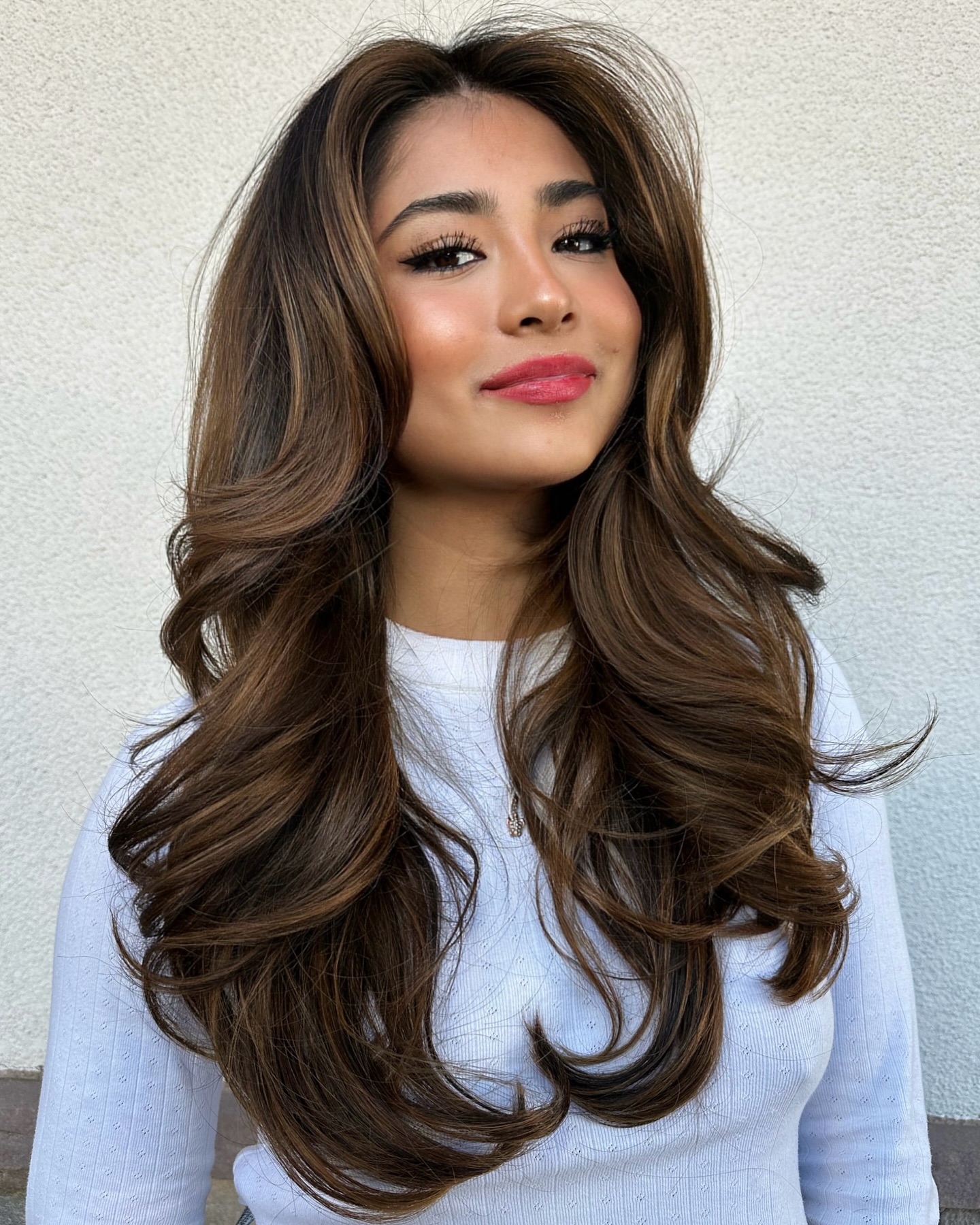 This highlighted brown butterfly haircut showcases bold, voluminous layers with a smooth finish. The long layers straight hair style combined with feathered ends creates a dynamic and full-bodied look. Ideal for adding depth and style, this cut complements a range of face shapes.
