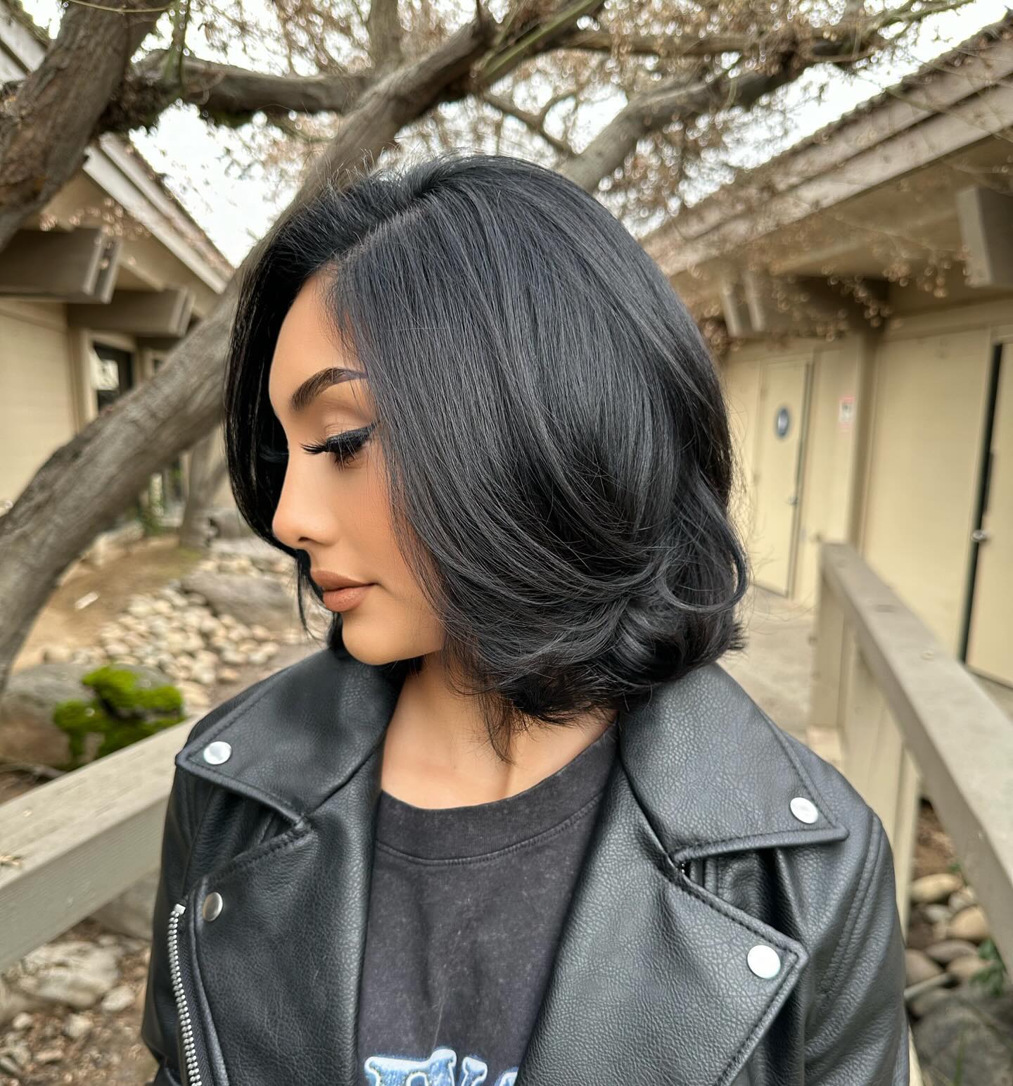 This butterfly cut features a sleek black bob with soft, voluminous waves that frame the face beautifully. The short hair shoulder length style offers a polished, refined look while maintaining a touch of movement. Ideal for those seeking a chic and manageable style with medium short layers.