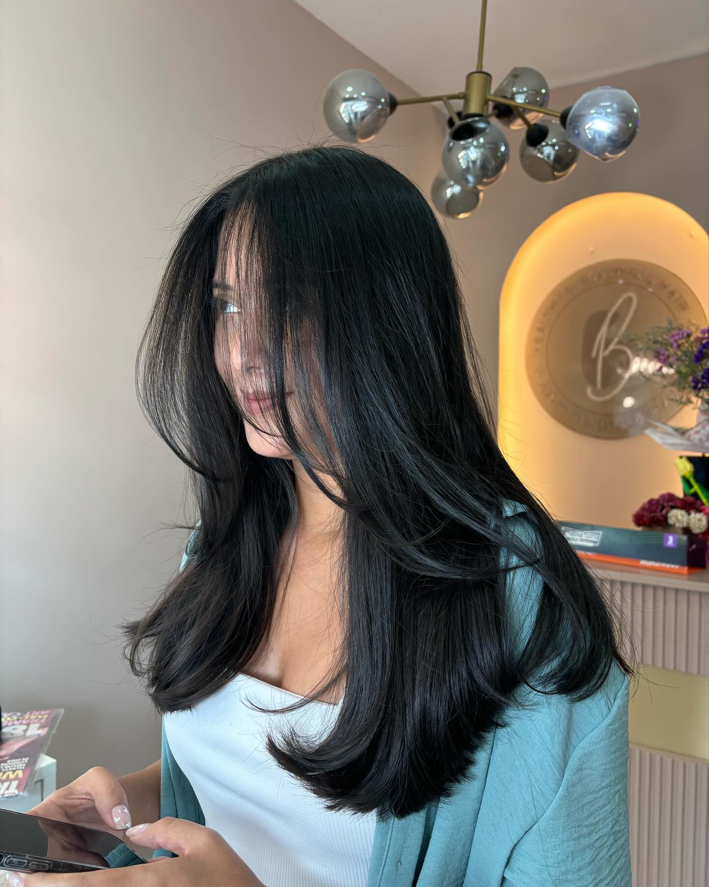 This sleek, dark butterfly cut features curtain bangs and soft layers that add subtle volume to the length. The rich black tone enhances the elegance of the long hair straight with curtain bangs look, making it ideal for a classic and sophisticated appearance. This style is perfect for anyone seeking a refined, low-maintenance hairstyle.