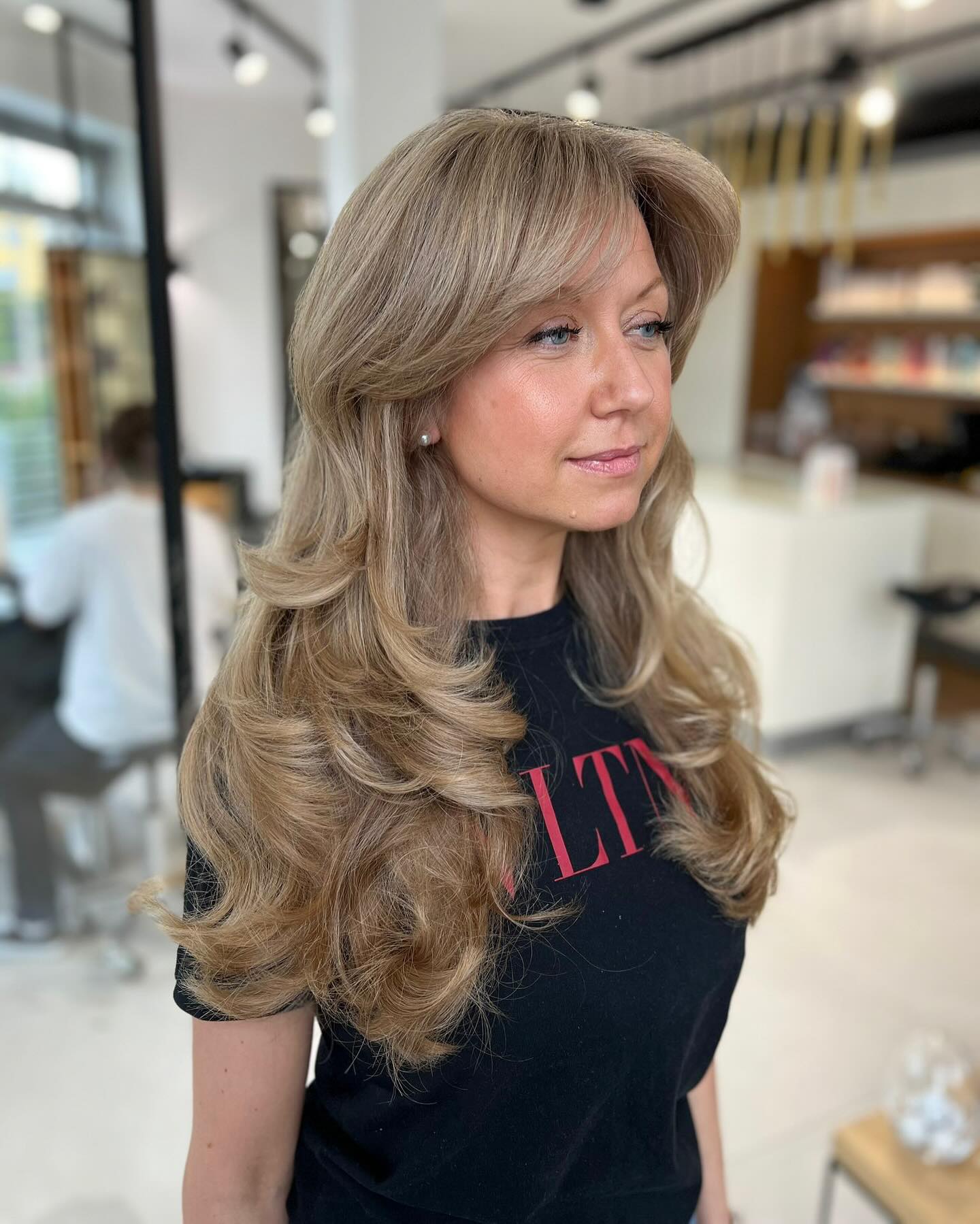 This hairstyle features soft blonde waves with voluminous curtain bangs, enhancing the layered texture and movement. The butterfly haircut 2025 style adds a sense of fullness and complements long hair straight with curtain bangs. It’s a flattering look for those wanting a blend of elegance and relaxed style.
