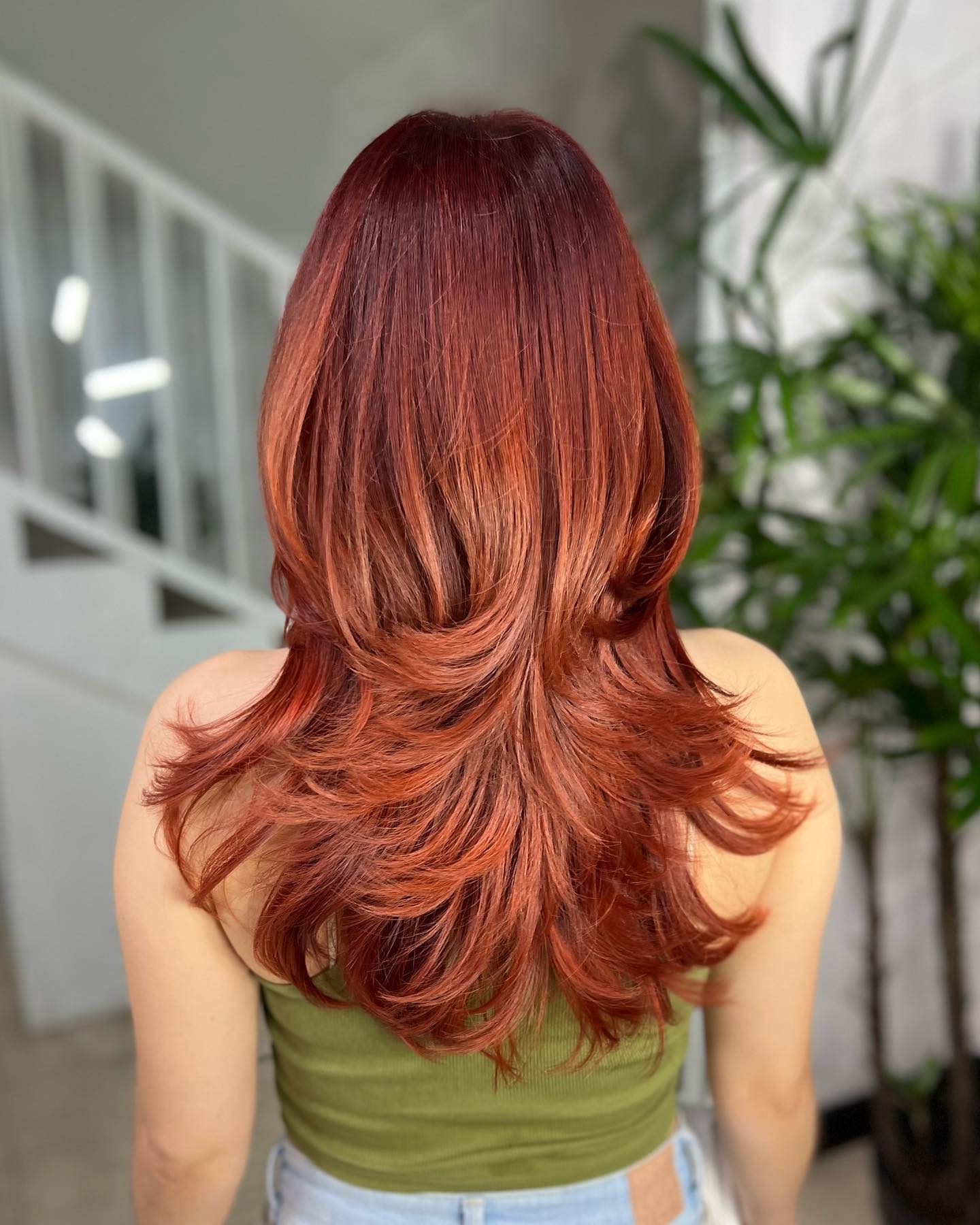 This vibrant red butterfly haircut showcases layers with feathered ends that add texture and bounce. The bold color enhances the long layers style, creating a dynamic, eye-catching effect. It’s perfect for those looking to make a statement with a warm, lively hue.